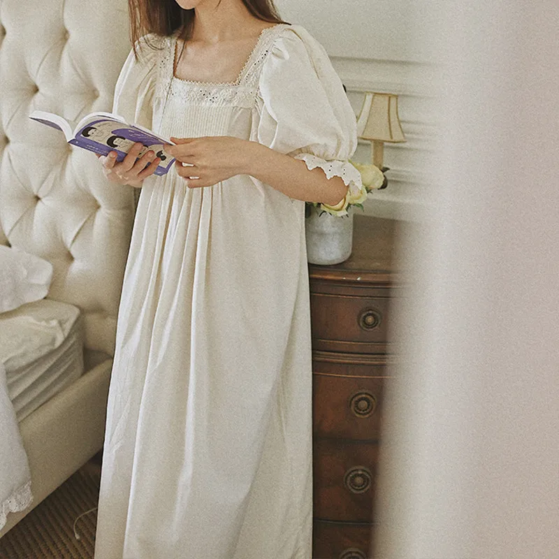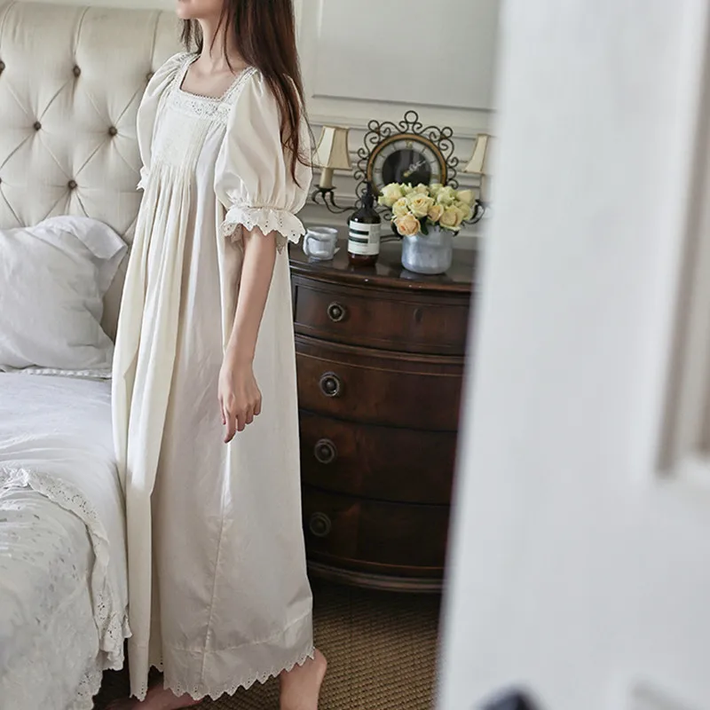 Princess Victoria Vintage Long Ankle-Length Nightdress French Square Collar Loose Nightie Summer Short Sleeves 100% Cotton Comfortable Nightgowns Home Dresses
