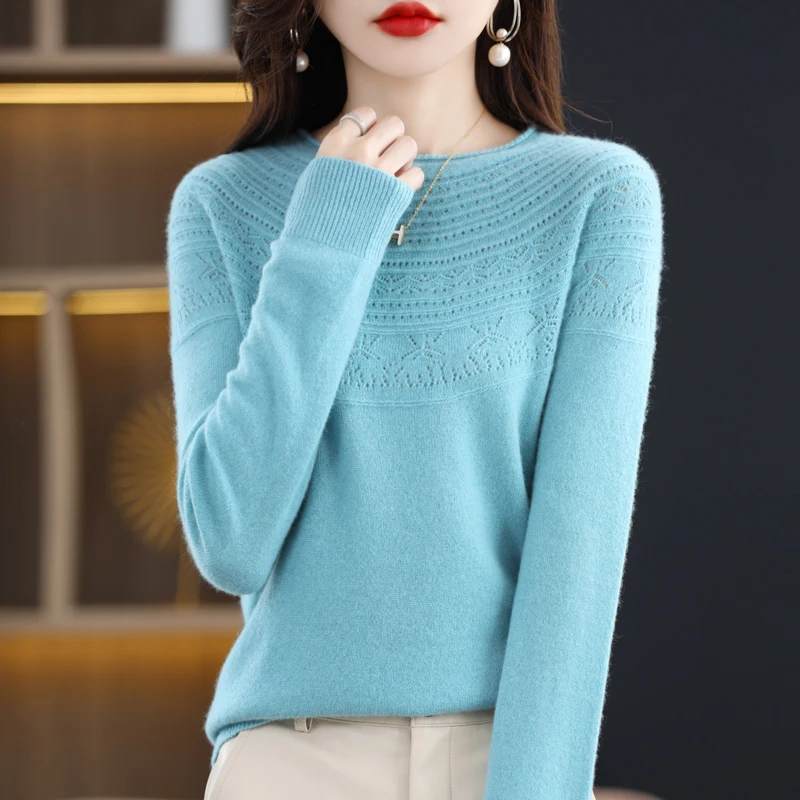 100% Merino Wool Knitted Sweater Autumn/Winter 2024 New Women’s Round Neck Hollow Top 11 Color Pullover Versatile Coat NJR1107