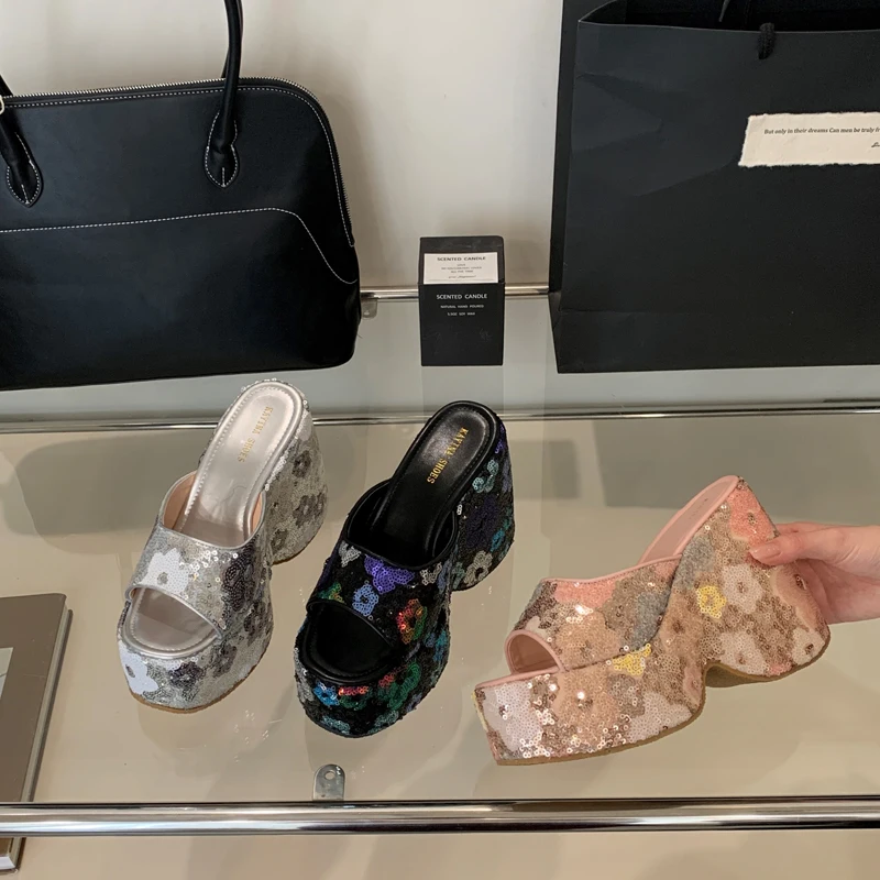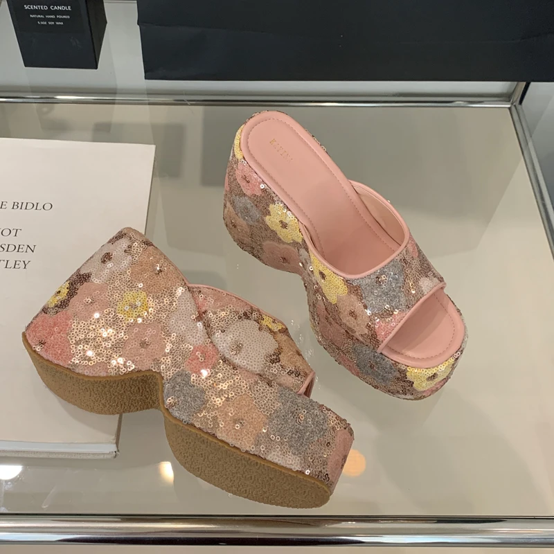 13cm Black Wedge Sandals Women Pink Flower Print Platform High Heels Slippers Summer Ladies Shoes Silver 13CM Heeled Sandals