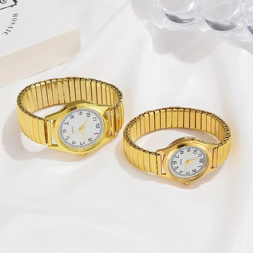2 PCS Of Gold Retro Round Pointer Quartz Watch Classic Simulation Elastic Band Watch Suitable For Both Male And Female Couples