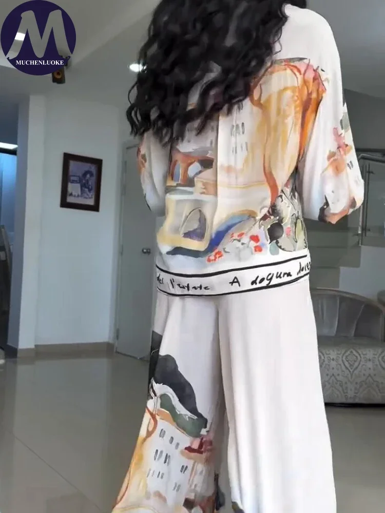 2 Pieces Set for Woman Summer New Elegant Casual Printed Lantern Sleeves Shirt Tops Suits Fashionable Loose Wide Leg Pants Sets
