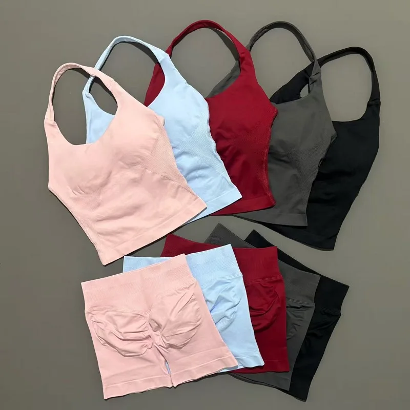 2 Pieces Shorts Yoga Set Women Backless Halter Tops High Waist Seamless Shorts Gym Suit Fitness Sportswear Workout Sets