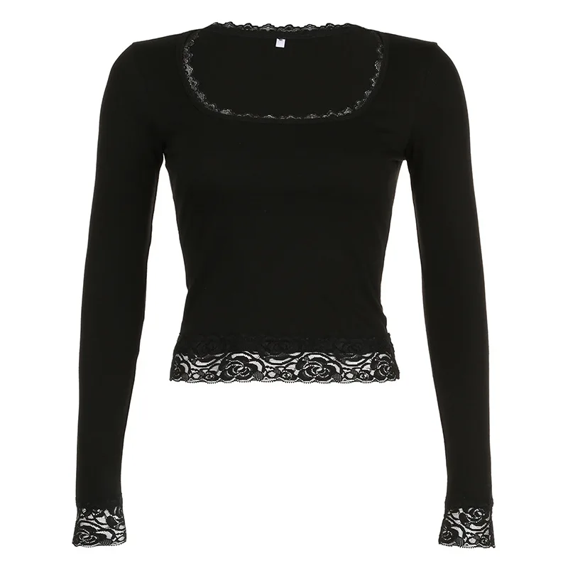 2000s Graphic T Shirt Vintage Fairy Grunge Women Autumn Lace Trim Long Sleeve Slim Fits Tops y2k Clothes Basic Harajuku Tees