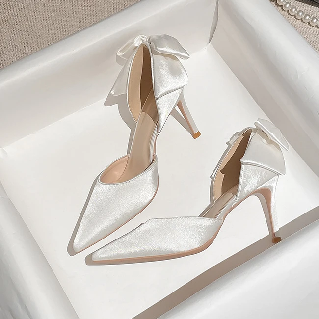 2022 New Solid Color Fashion Design Stiletto Bow Hollow Women’s Wedding Shoes Women’s Exquisite Shallow Mouth Satin High Heels