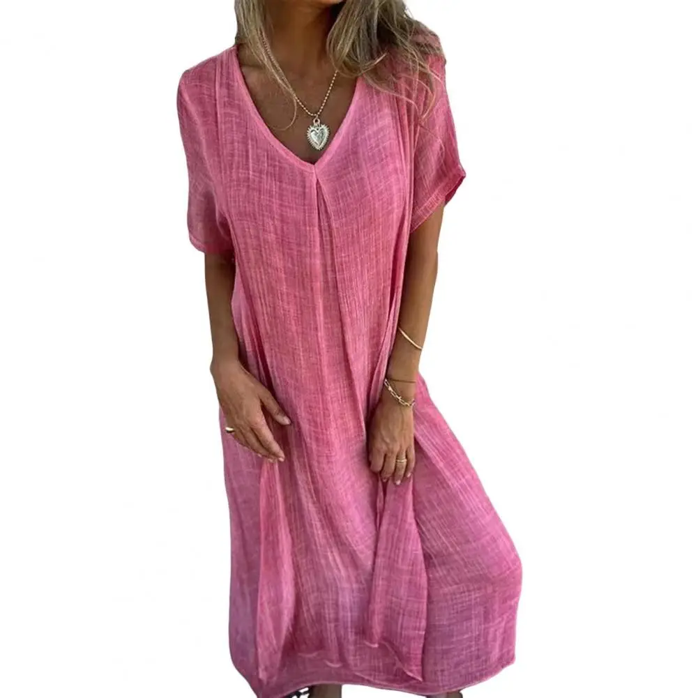 2024 Bohemian Style Cotton Linen Loose Dress Women’s V-neck Dress Vintage Straight Beach Dress Soft Breathable Long Dresses