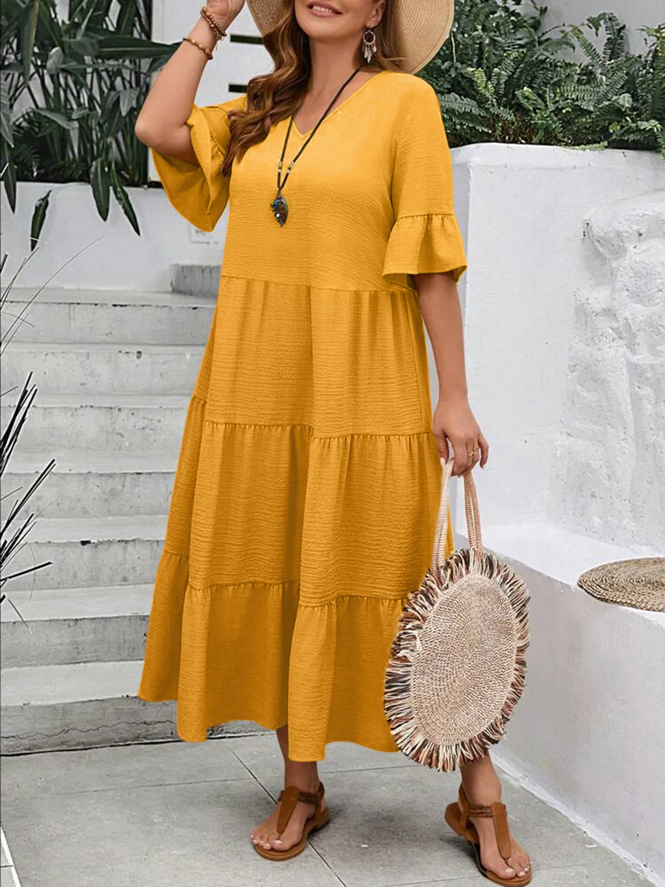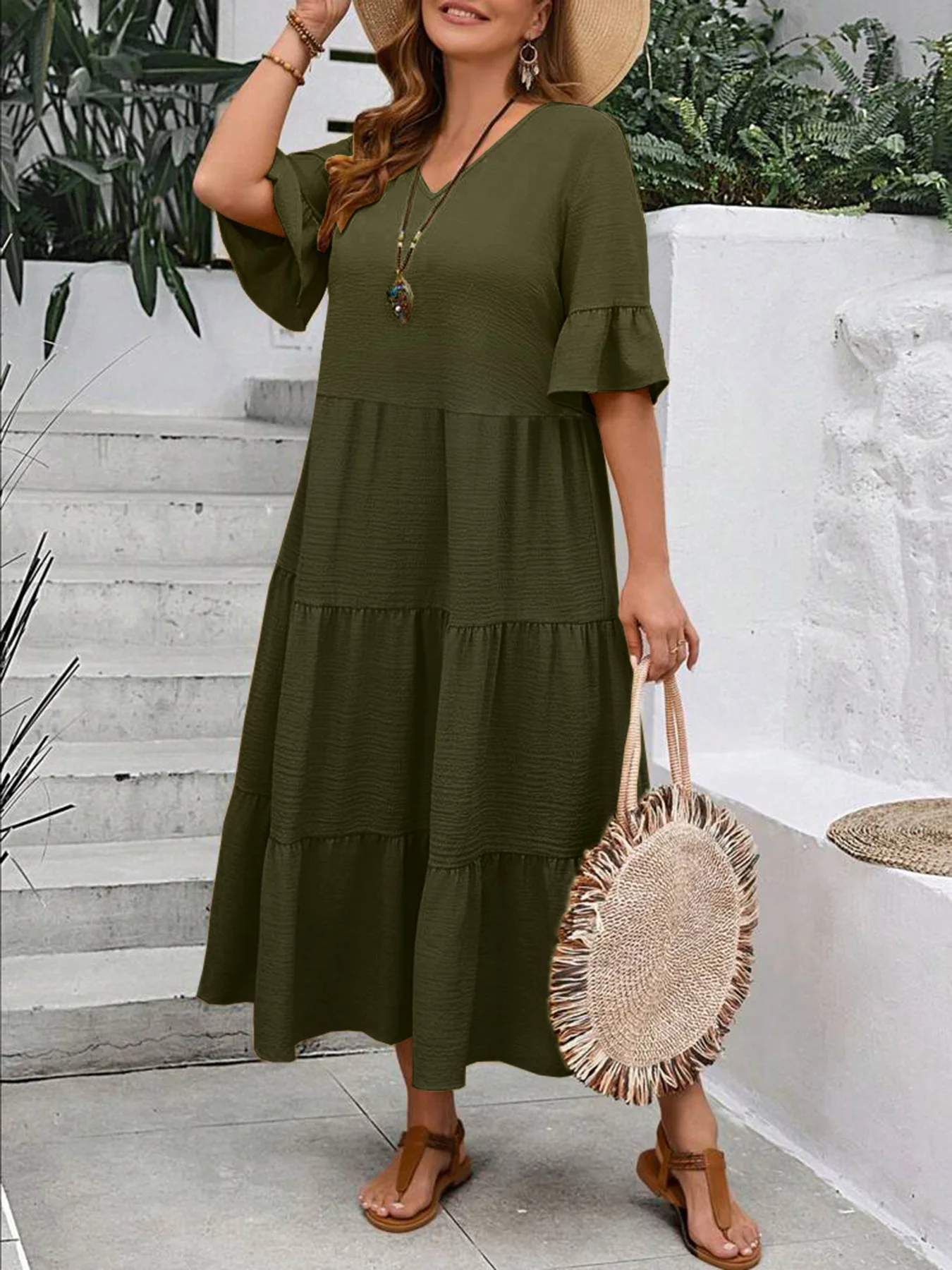 2024 Spring and Summer Amazon Europe and America New V-neck Splicing Multi color Multi size Long Swing Dress Plus Size