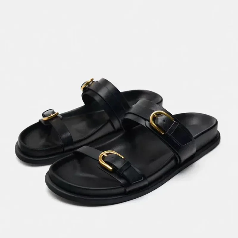 2024 Summer Beach Slippers for Woman Casual Outdoor Black Buckled Strap Female Flat Shoes Soft PU Leather Chic Ladies Slides