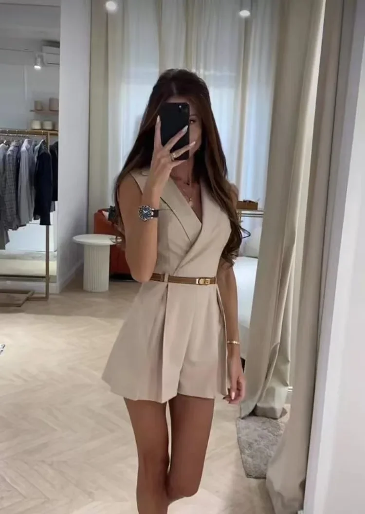 2024 Summer Elegant Women’s Jumpsuit With Belt Fashion Sleeveless Turndown Collar Slim Short Jumpsuits Female Sping Lady Romper