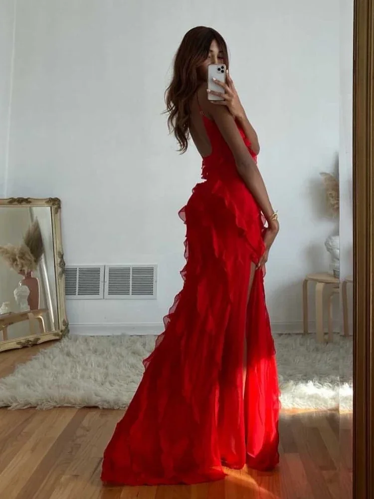 2024 Summer Fashion New Elegant Women’s Sexy Chiffon Vacation Style Sling Dress with Ruffle Edge Style Long Dress