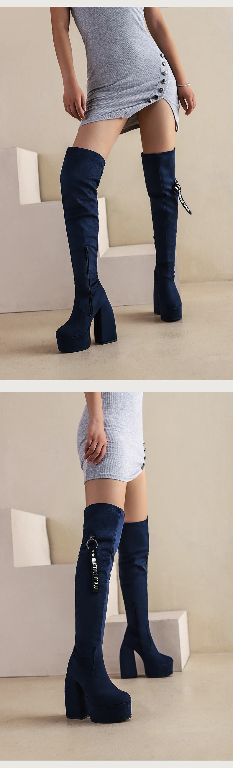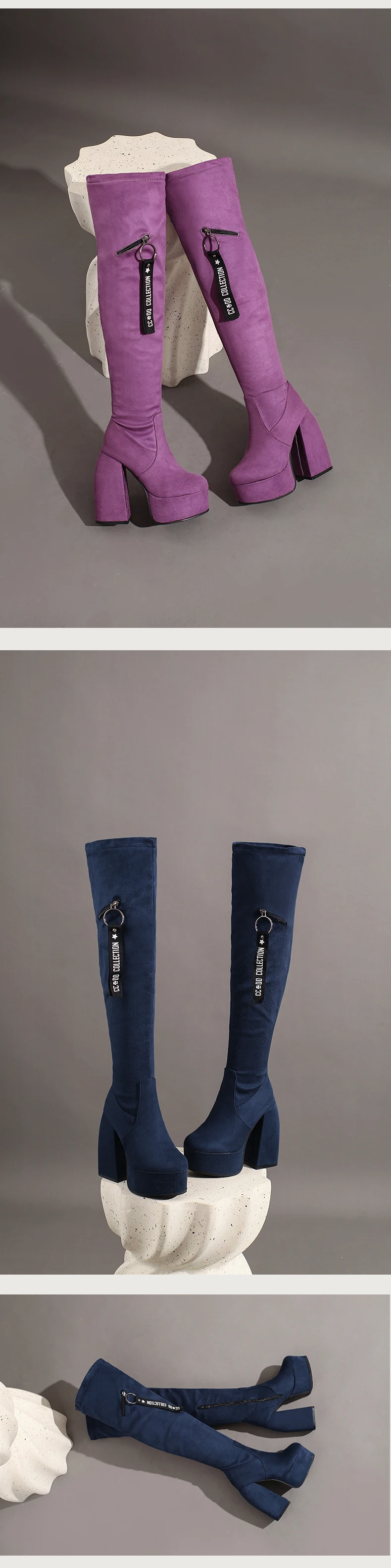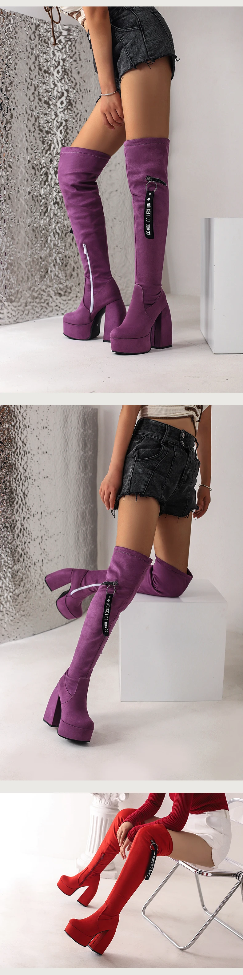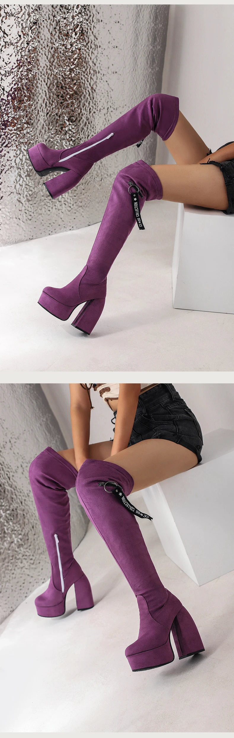 2024 Ultra-High Profiled Hollow Thick Heel Frosted Flock Women’s Over-The-Knee Boots Plus Size High Platform Zipper Long Boots