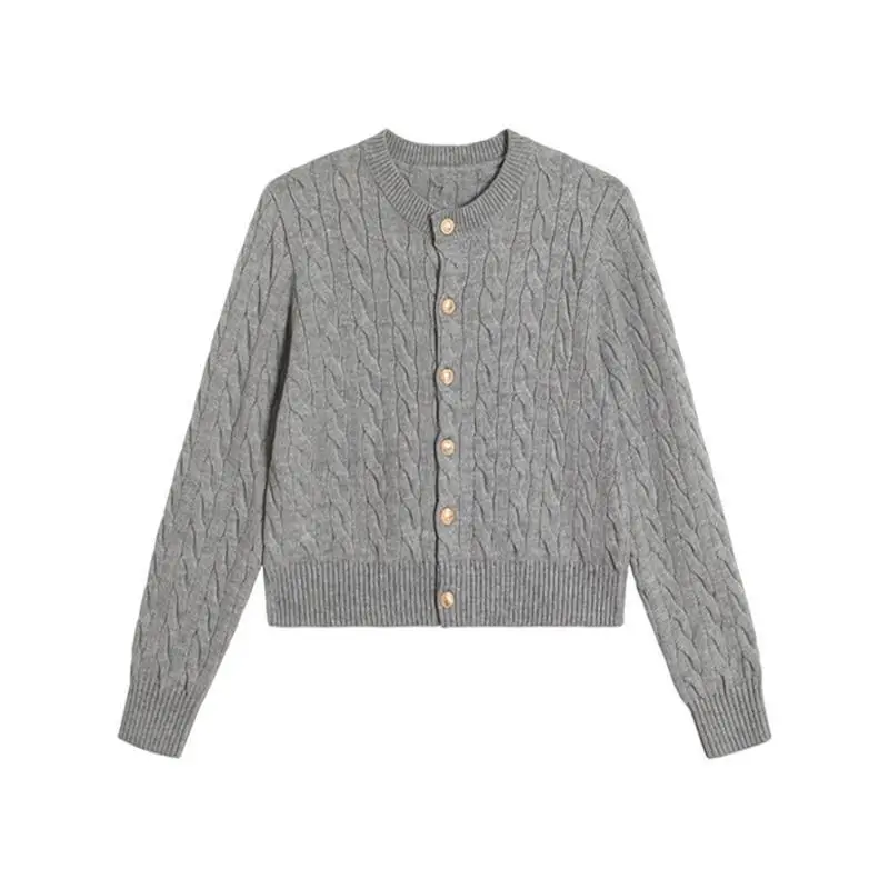 2024 Vintage Long Sleeve Cardigan Women Sweater O-neck Elegant Knitted Top Fashion Autumn Grey Knitwear