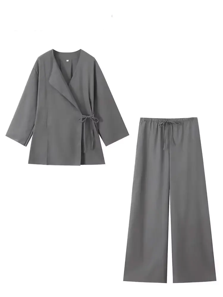 2024 Woman Trouser Set Solid V Neck Casual Kimono Style Lace Up Shirt Top + Elastic Waist Wild Women’s Wide Leg Long Pant