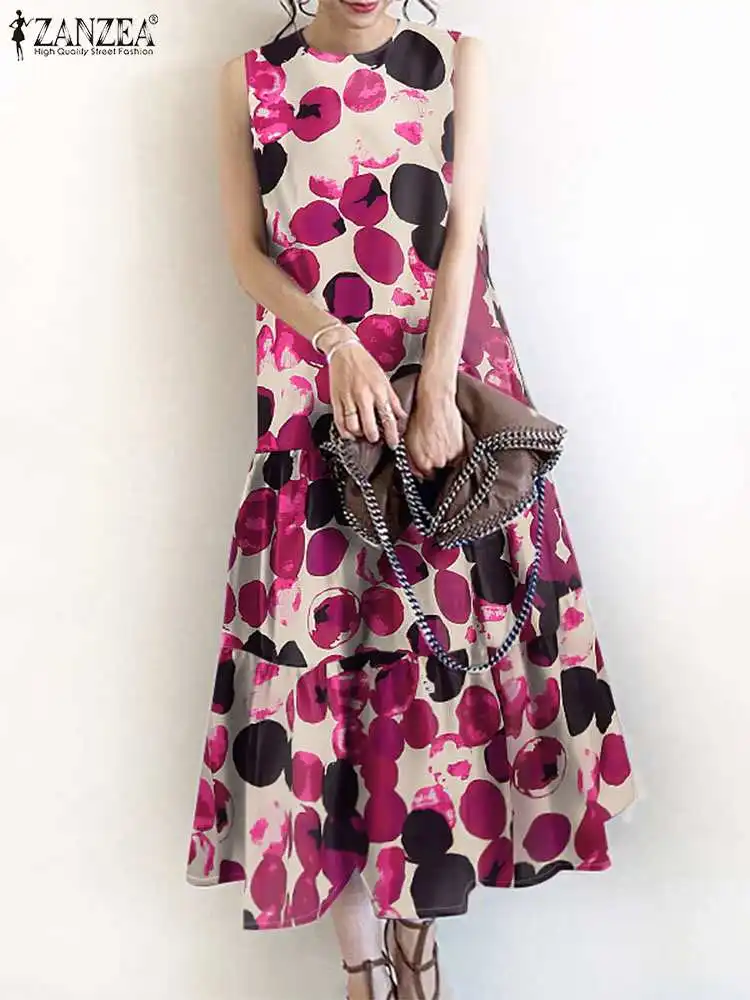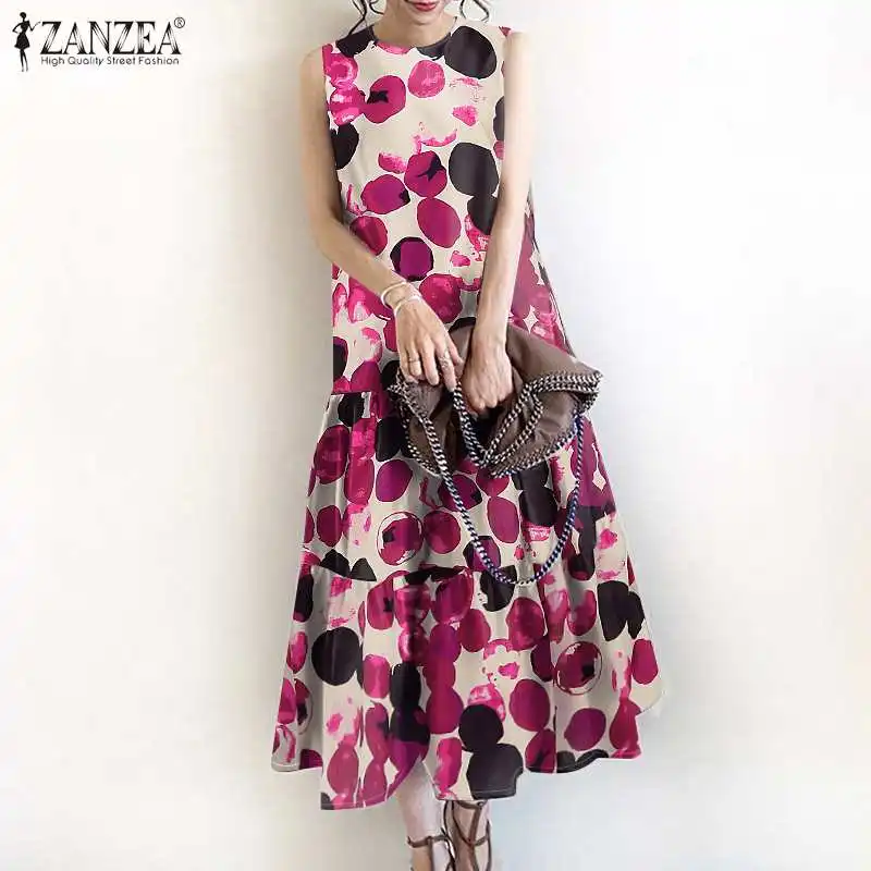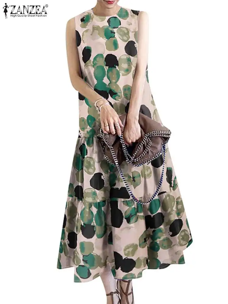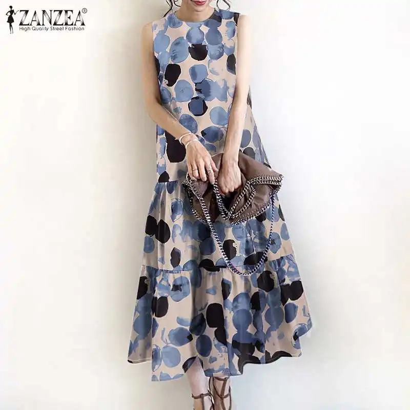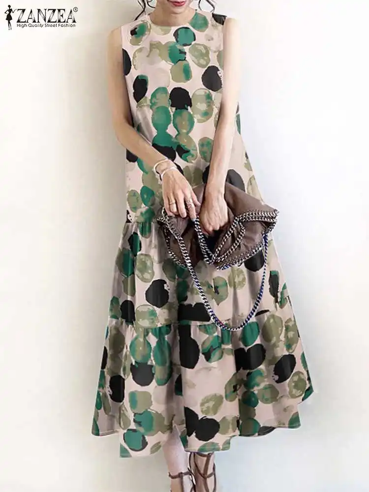 2024 ZANZEA Bohemian Sleeveless Summer Dresses Women Floral Printed Sundress Fashion Casual Ruffles Hem Long Vestido Robe Femme