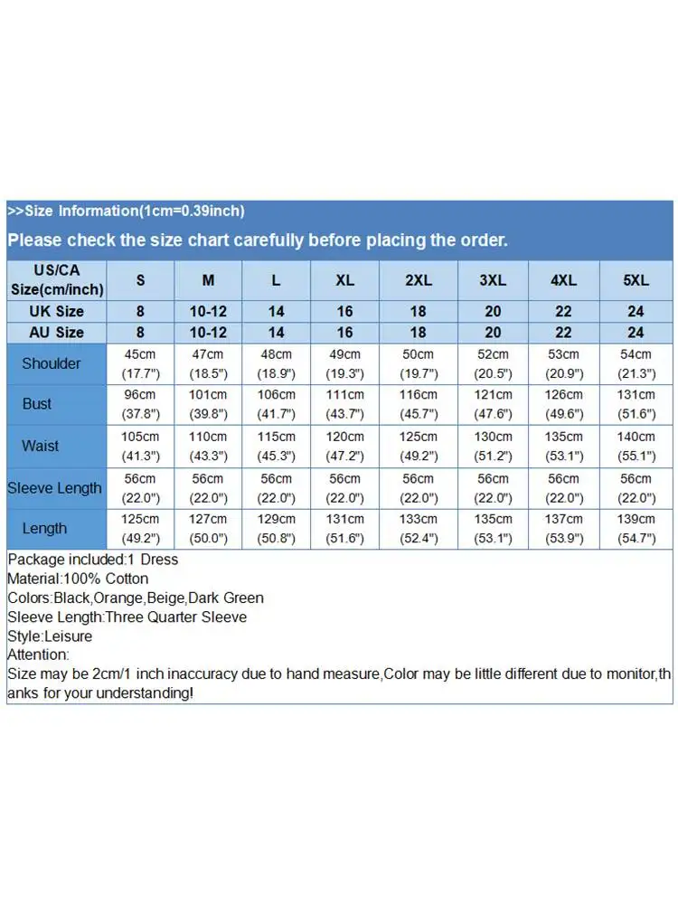 Material:100% Cotton Colors:Black,Orange,Beige,Dark Green Sleeve Length:Three Quarter Sleeve Neckline:O-Neck Pattern: Solid Colors Length:Mid-Calf Length Buckle chain:Button Down Back Thickness:Thin Decoration:Front Pockets Style:Leisure Season:Summer Occasion:Family,Holiday Label: Yes Attentions: 1.The Real Object May Exist Slightly Colors Differences Compared To Images As Different Computers Display.Caution If Minding,Thanks. 2.There Might Be A Manual Measuring 1-3 cm Error.Sorry For Any Inconvenience. 3.Please Prevail On Real Item, Model Images For Reference Only. 4.Attention!!!Please check the size chart carefully before placing the order.