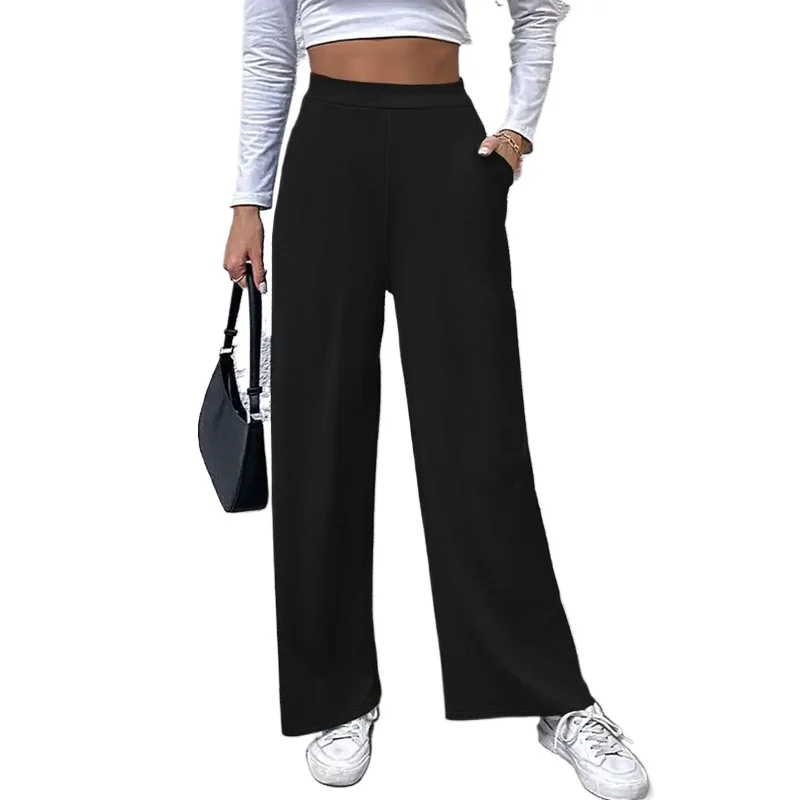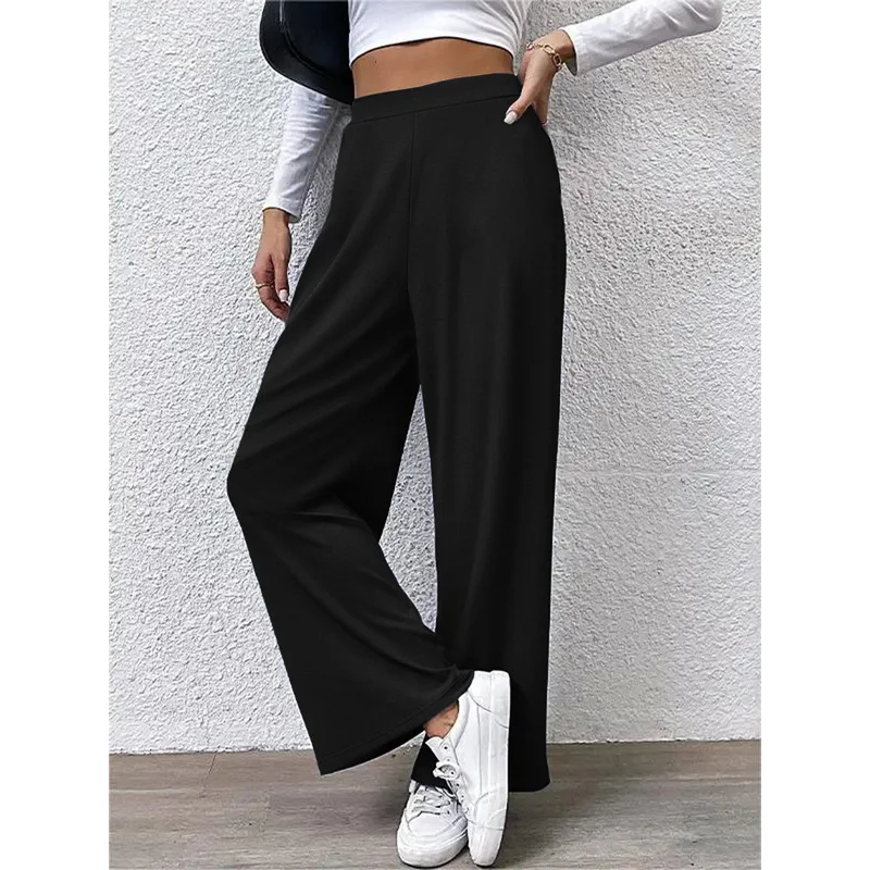 2025 Casual Straight Leg Pants Women Elastic Waist Stretchy Slimming Solid Black Office Daily Trousers