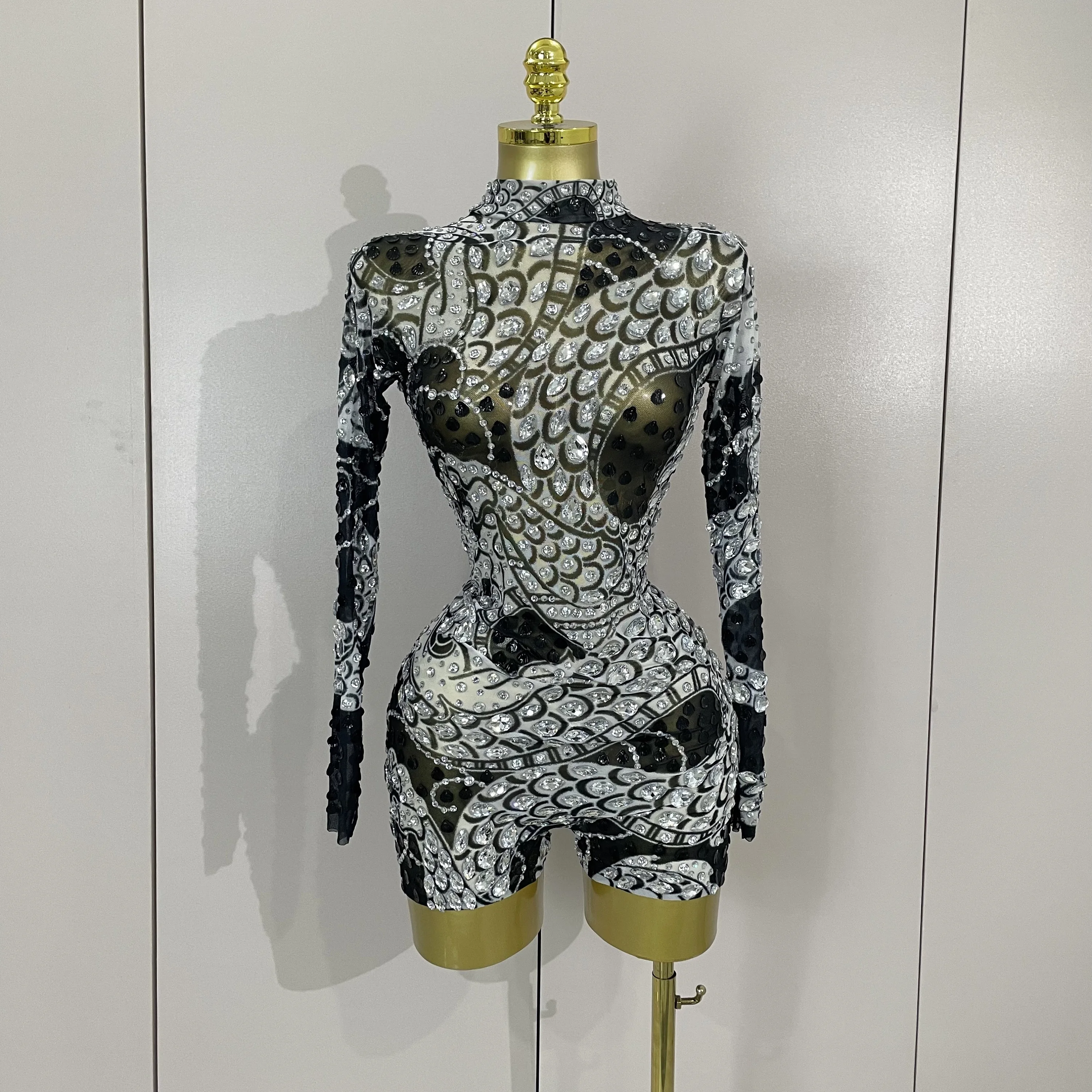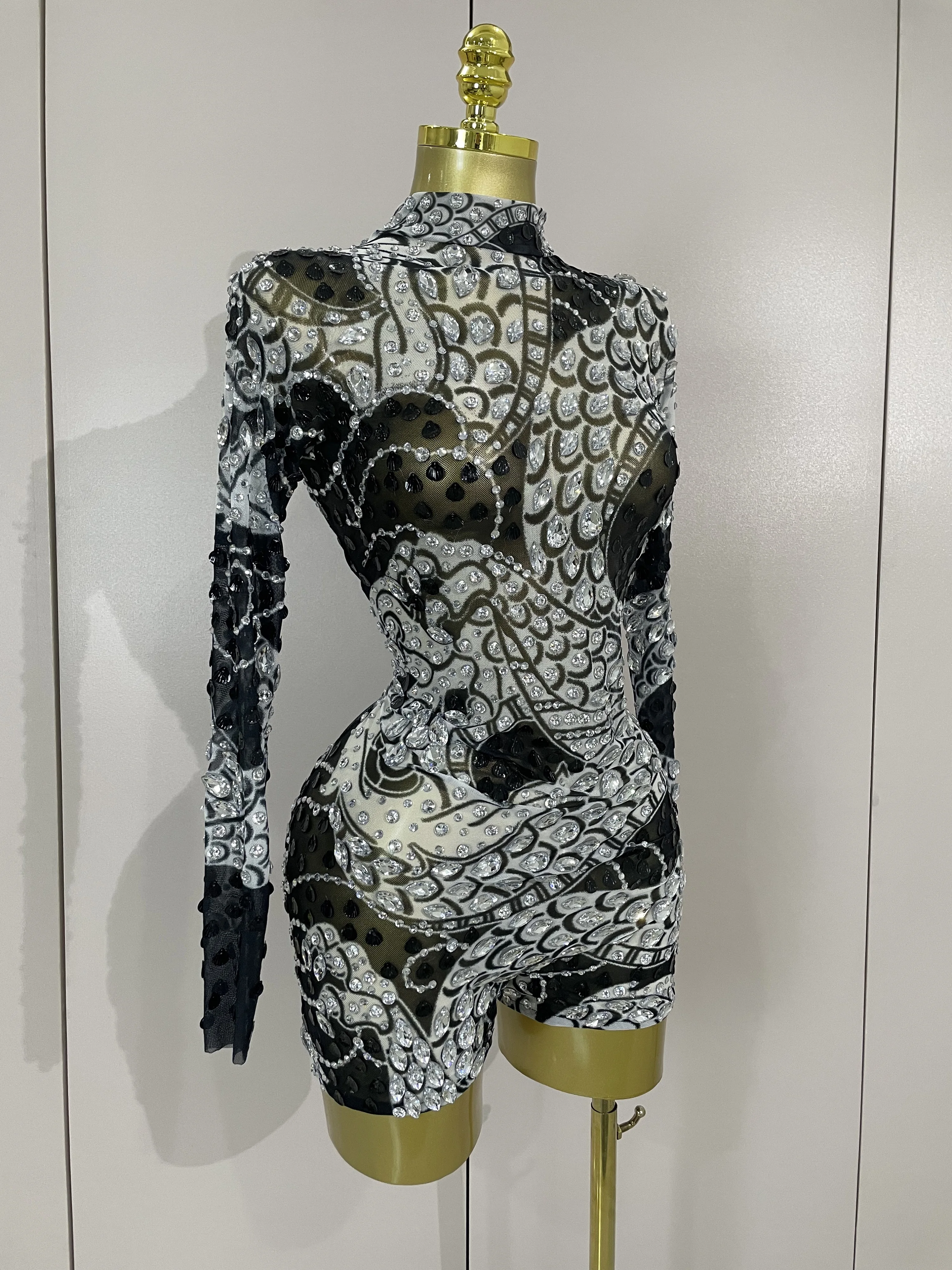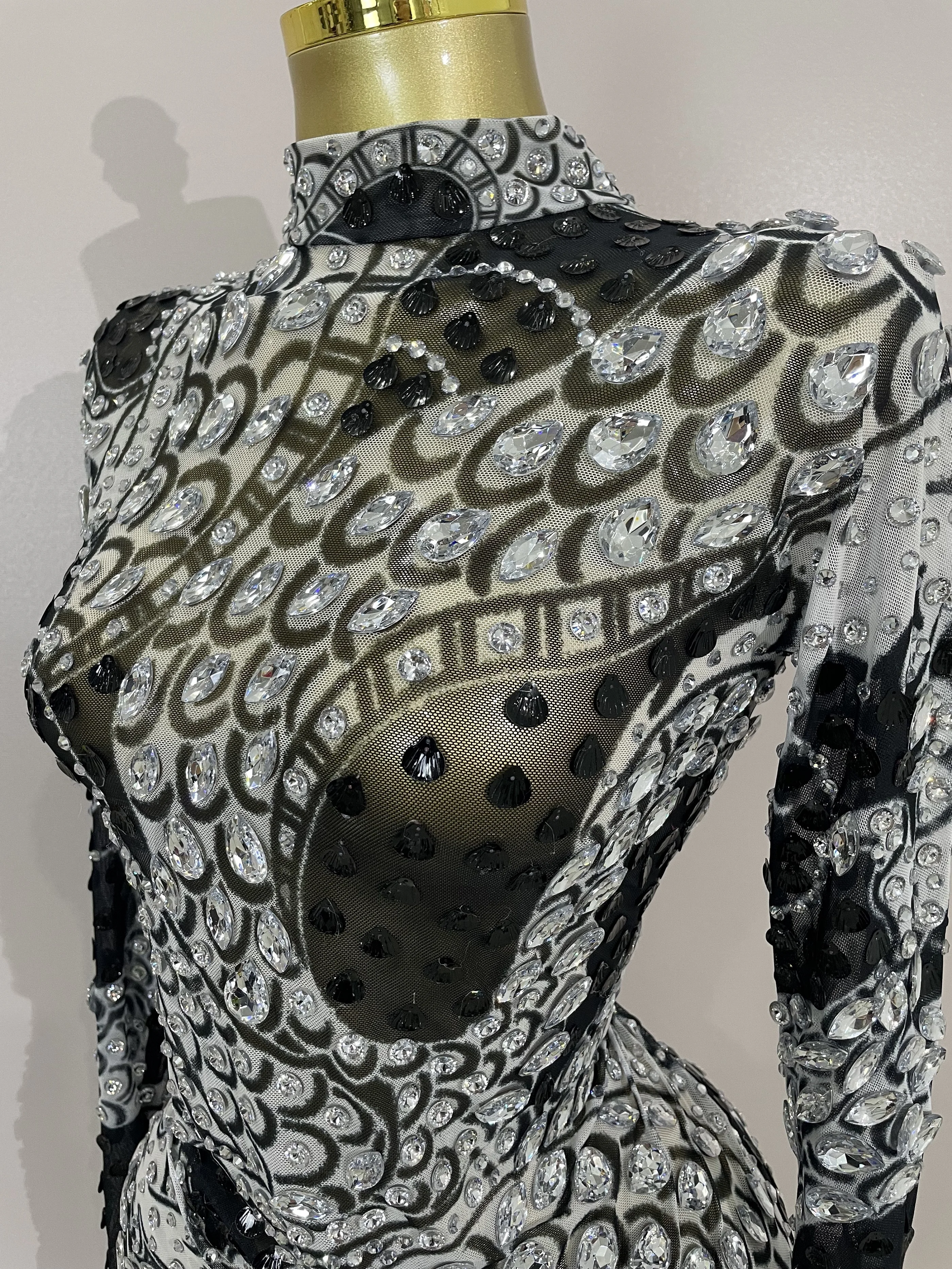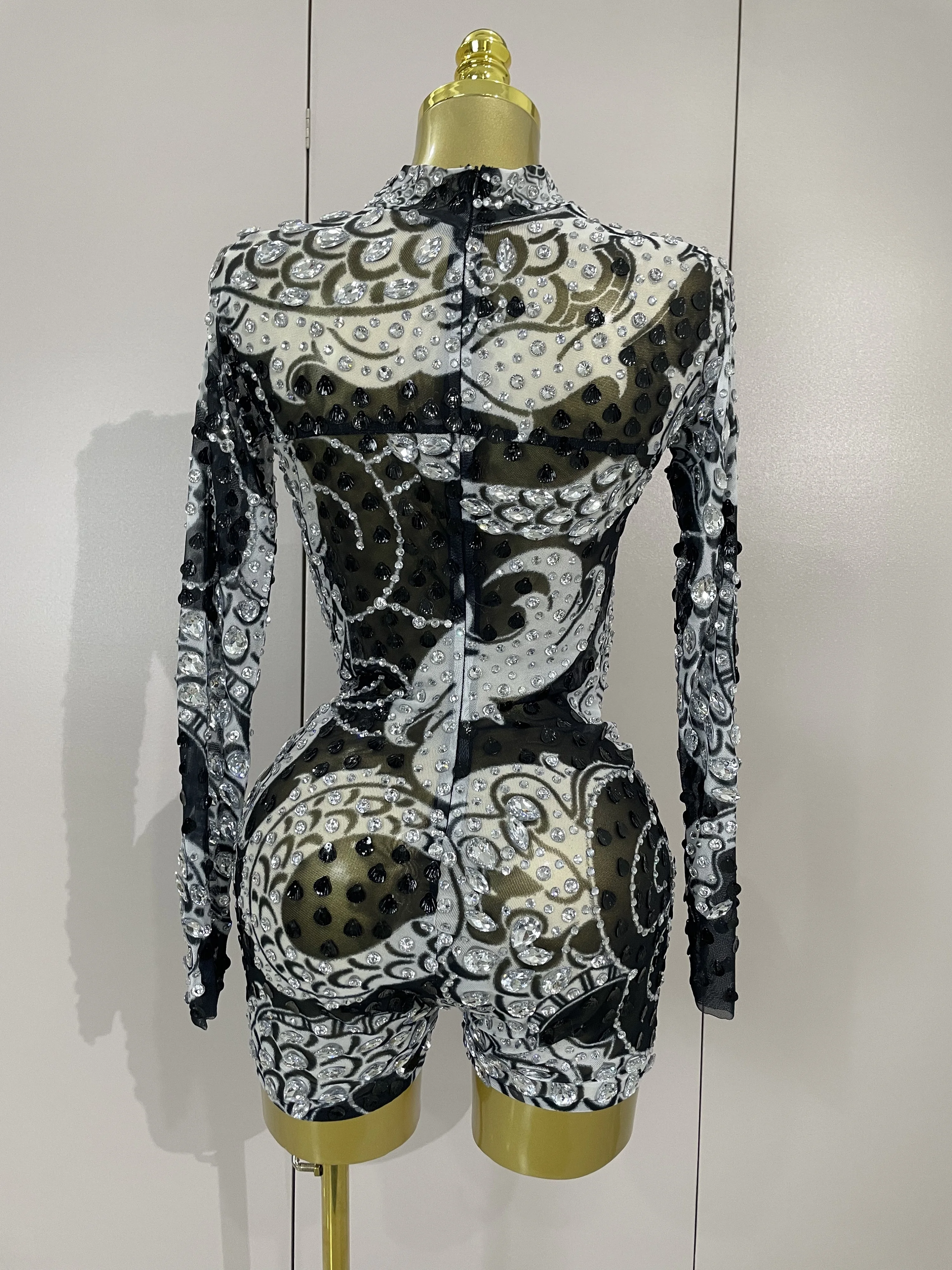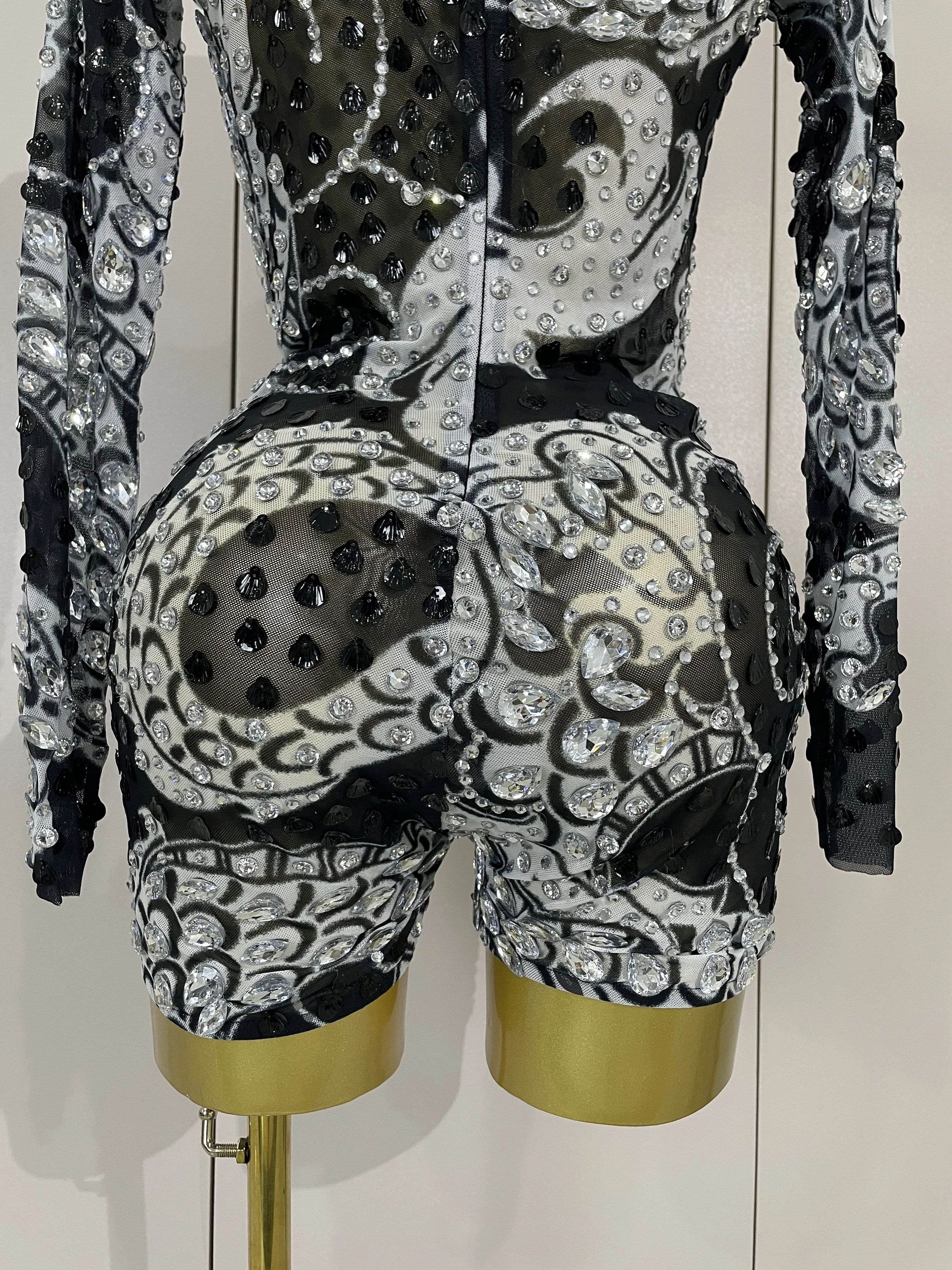 2025 Luxury Sparkly Diamonds Shell Long Sleeve Stretch Bodysuits Women Evening Birthday Party Sexy Nightclub DJ Stage Costumes