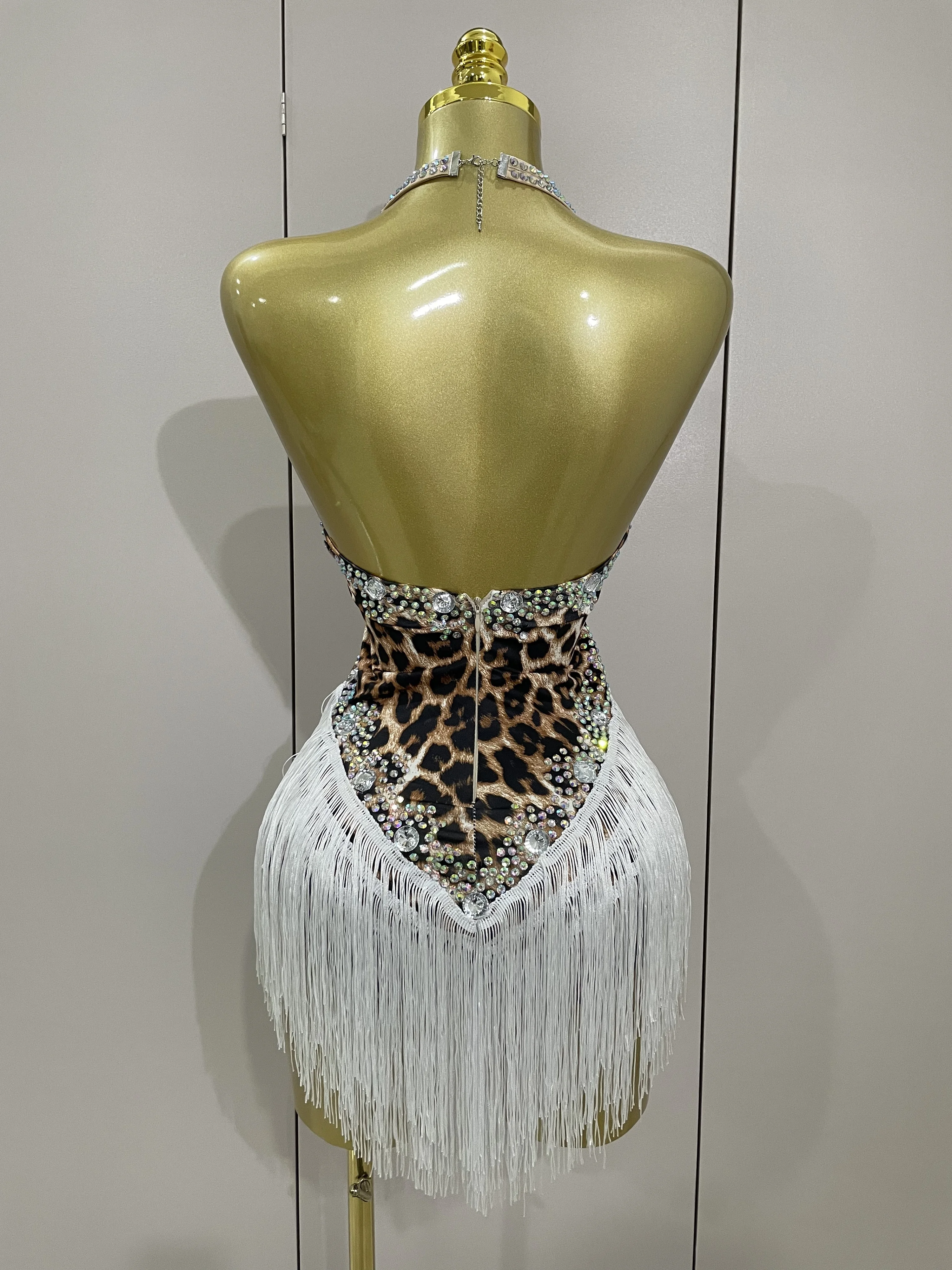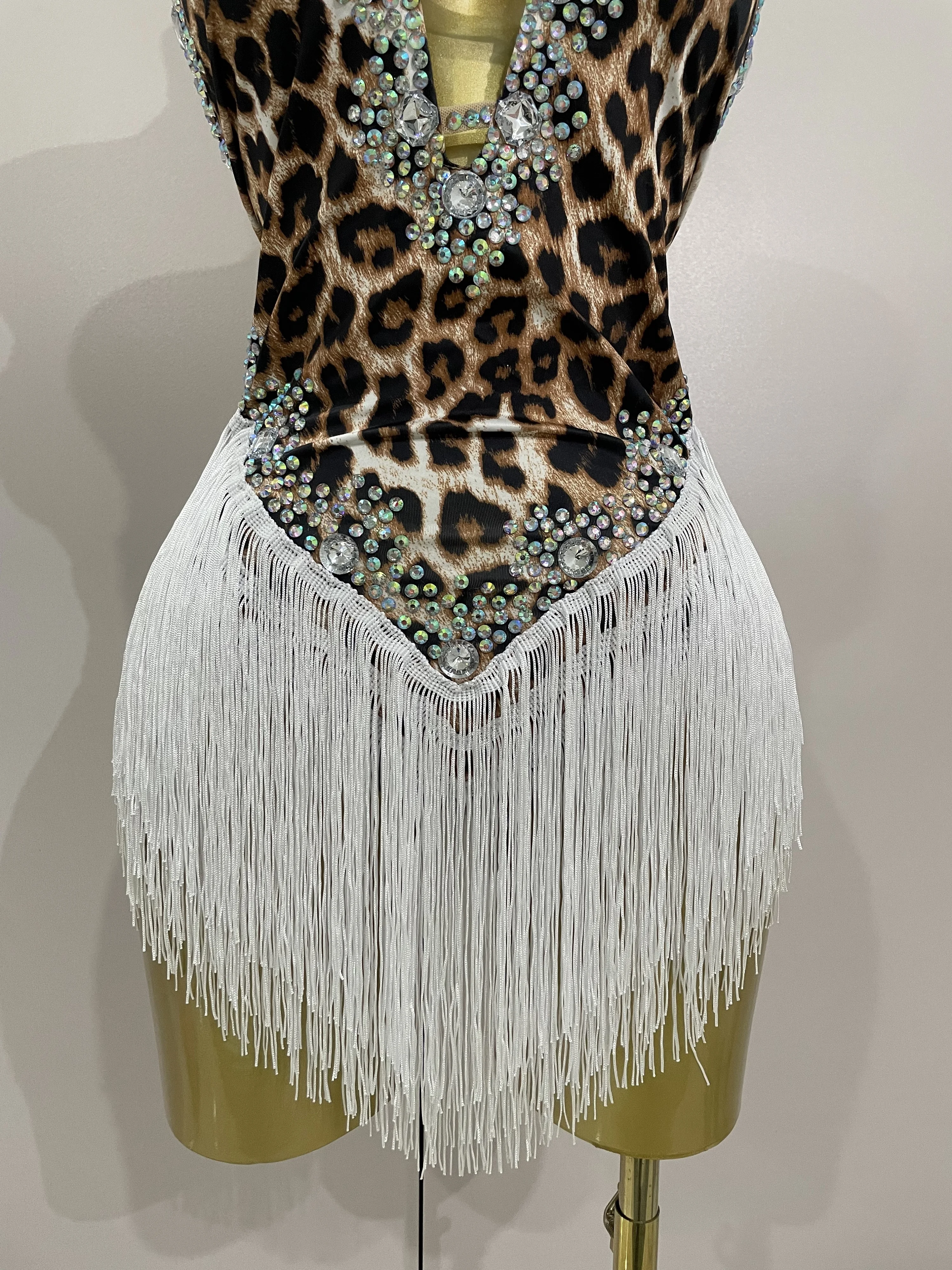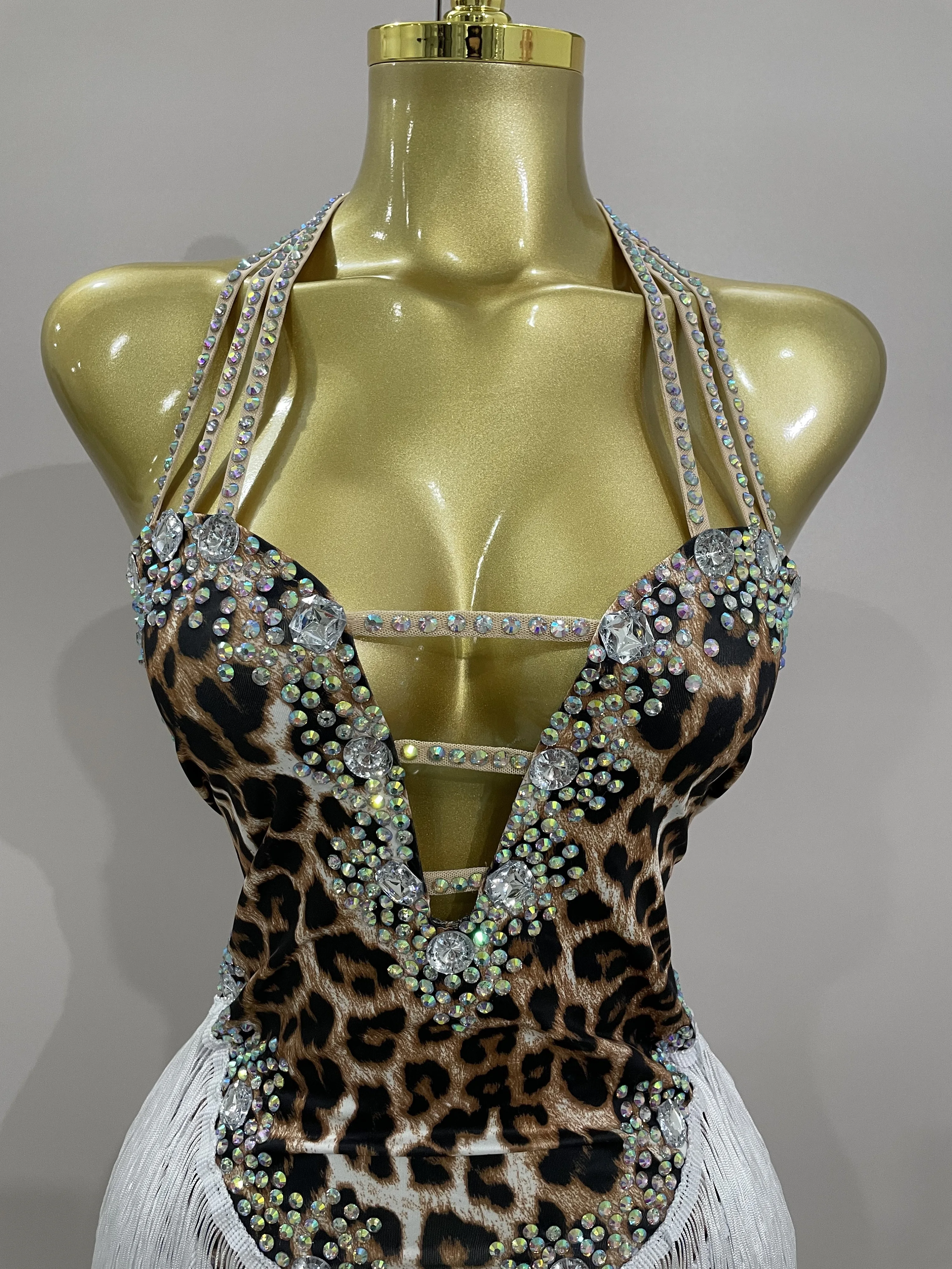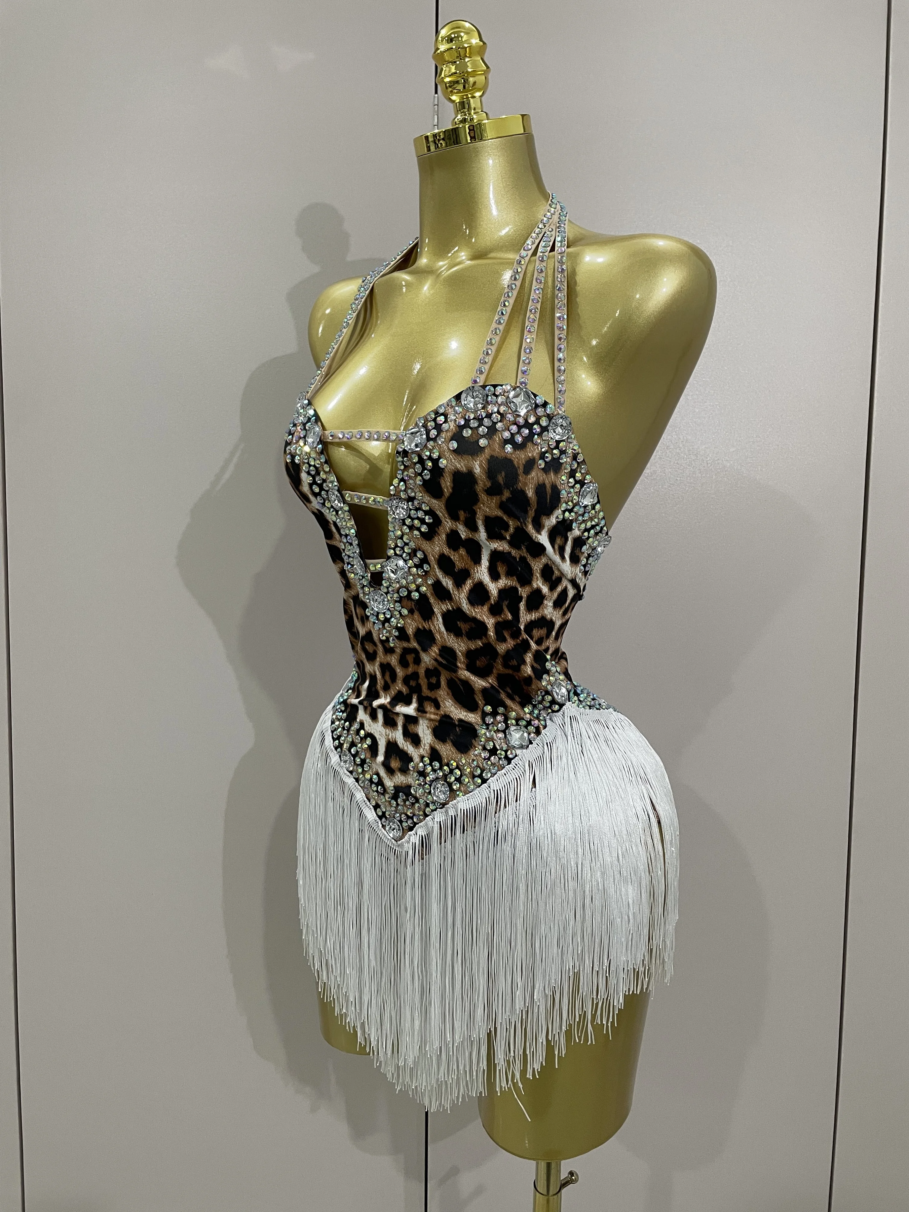 2025 New Sexy Sparkly Rhinestones Leopard Print Tassel Bodysuit Women Evening Party Birthday Nightclub Performance Stage Costume