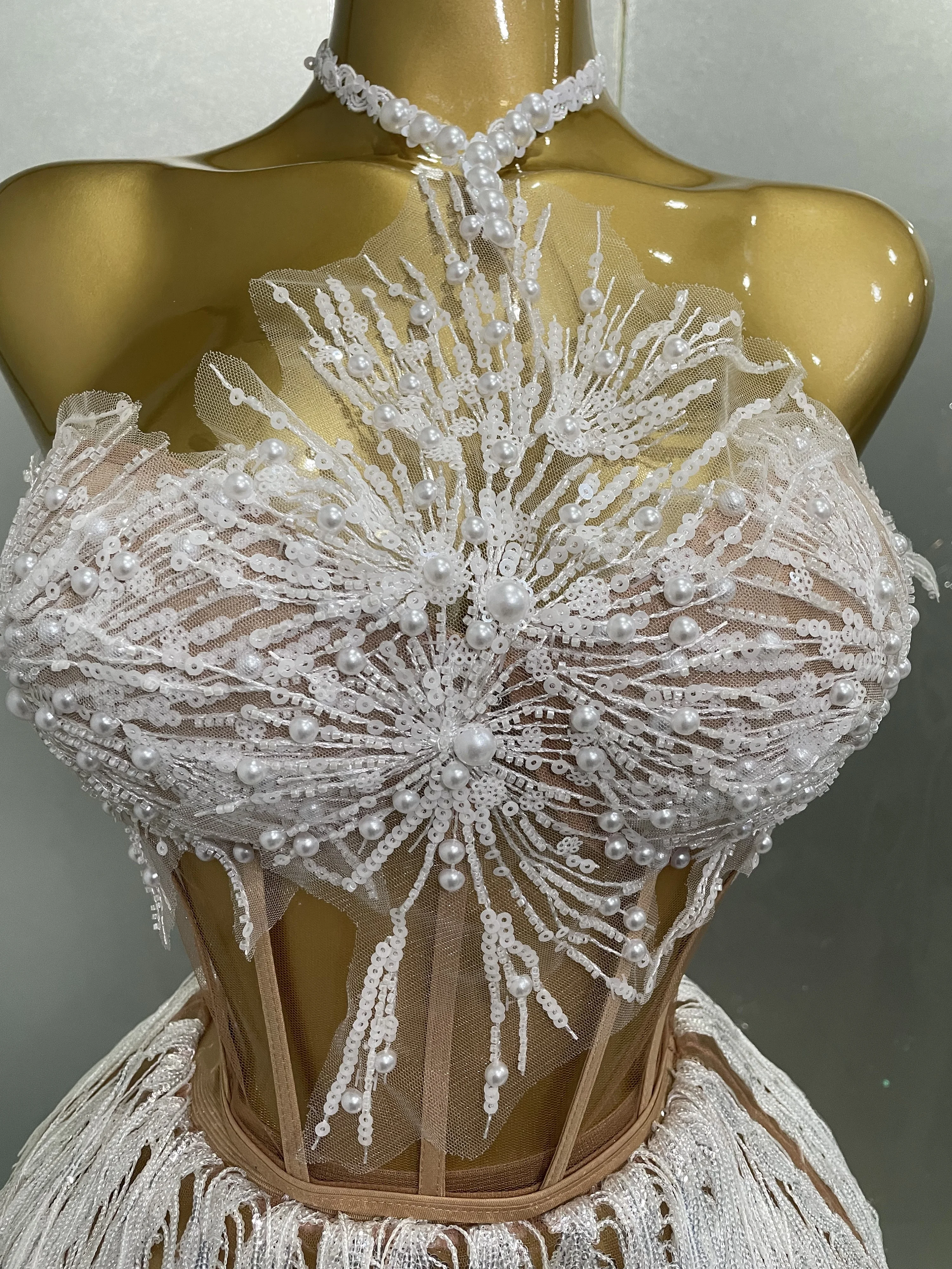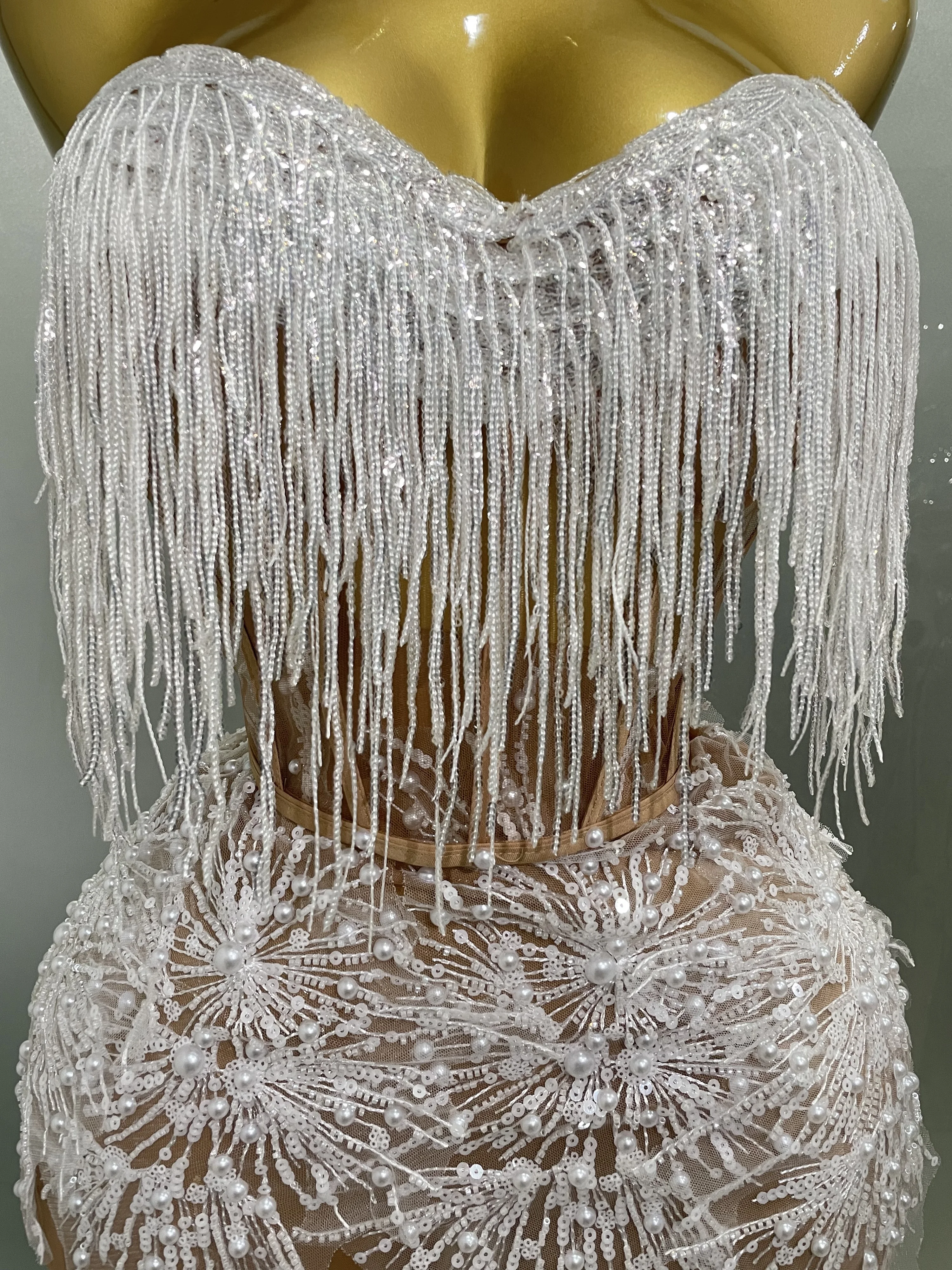2025 Sexy Pearl Sequins Tassel Sleeveless Glitter Mini Dress Women Singer Bar Nightclub Stage Performance Clothing Show Outfit