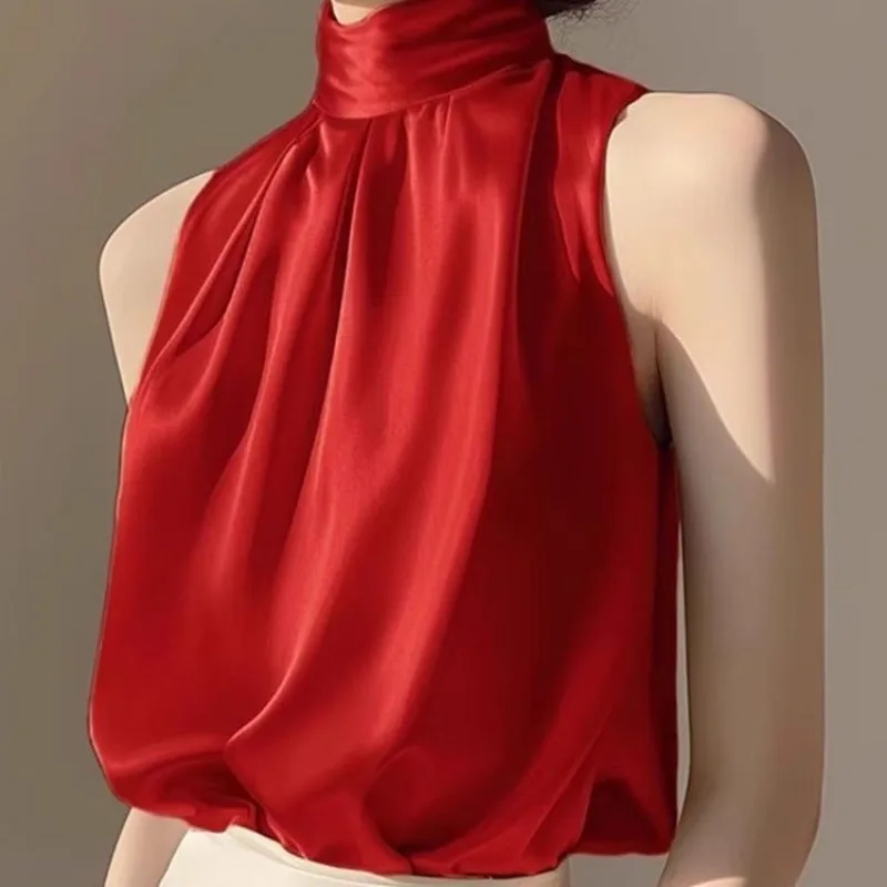 2025 Silkly Satin Sleeveless Crop Top Summer Half Turtleneck Women Pulover Tee Halter Vest Lady Loose Shirts Red party Blouses