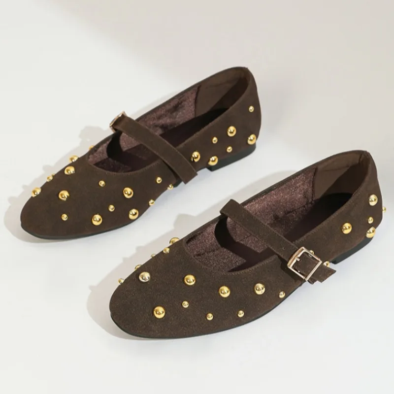 2025 Summer Brand Mary Jane Shoes for Women Fashion Rivet Suede Classic Retro Brown Casual Soft Bottom Comfortable Ladies Flats