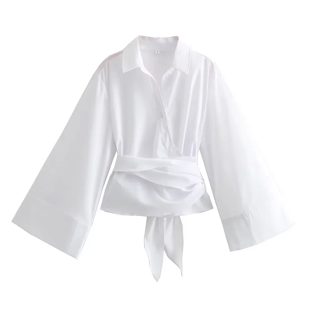 2025 Women Long Sleeve Kimono Shirt Double Breasted Satin Silk Feel Polo Collar Belted Office Chic Spring Autumn Party Blouse