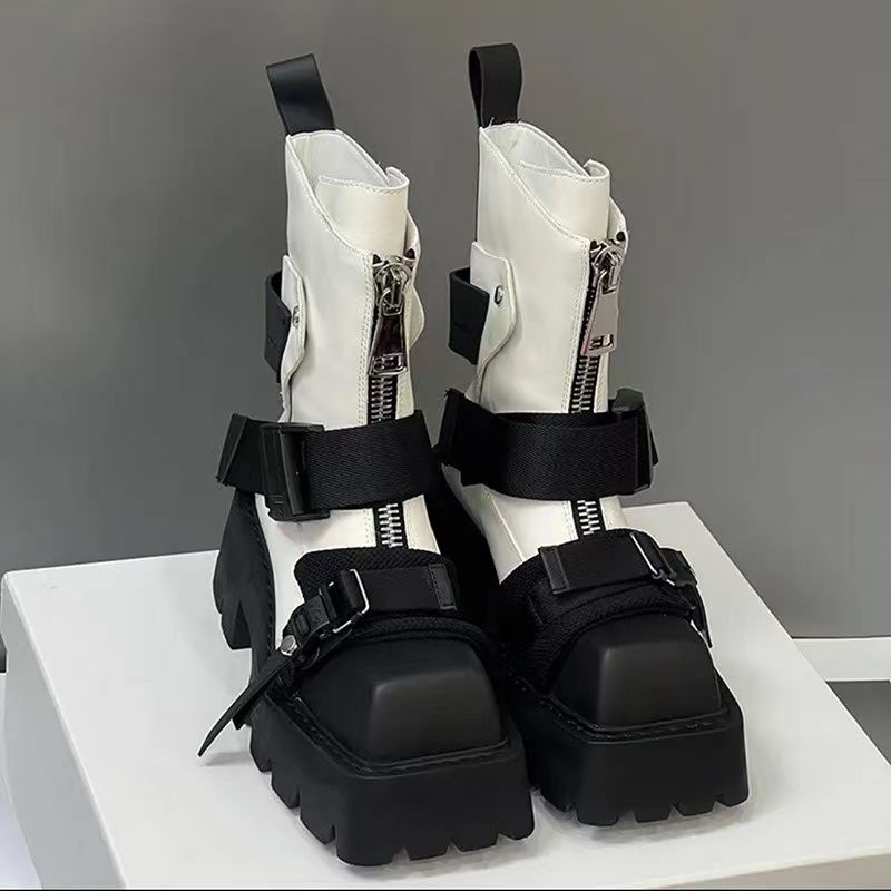 2025 Women Top Layer Cowhide Female Square Toe Western Front Zipper Color Matching Thick Bottom Belt Buckle Booties Chelsea