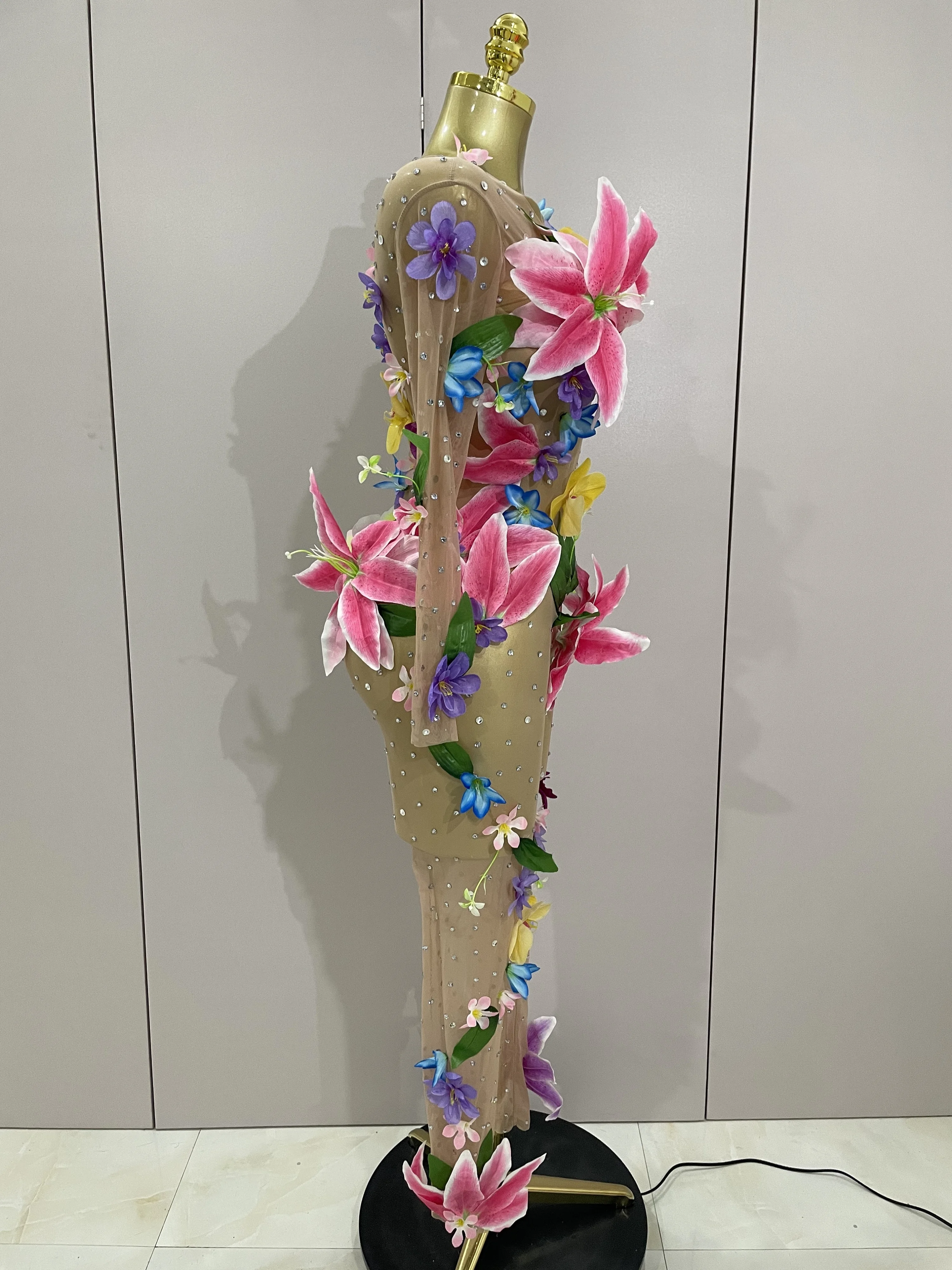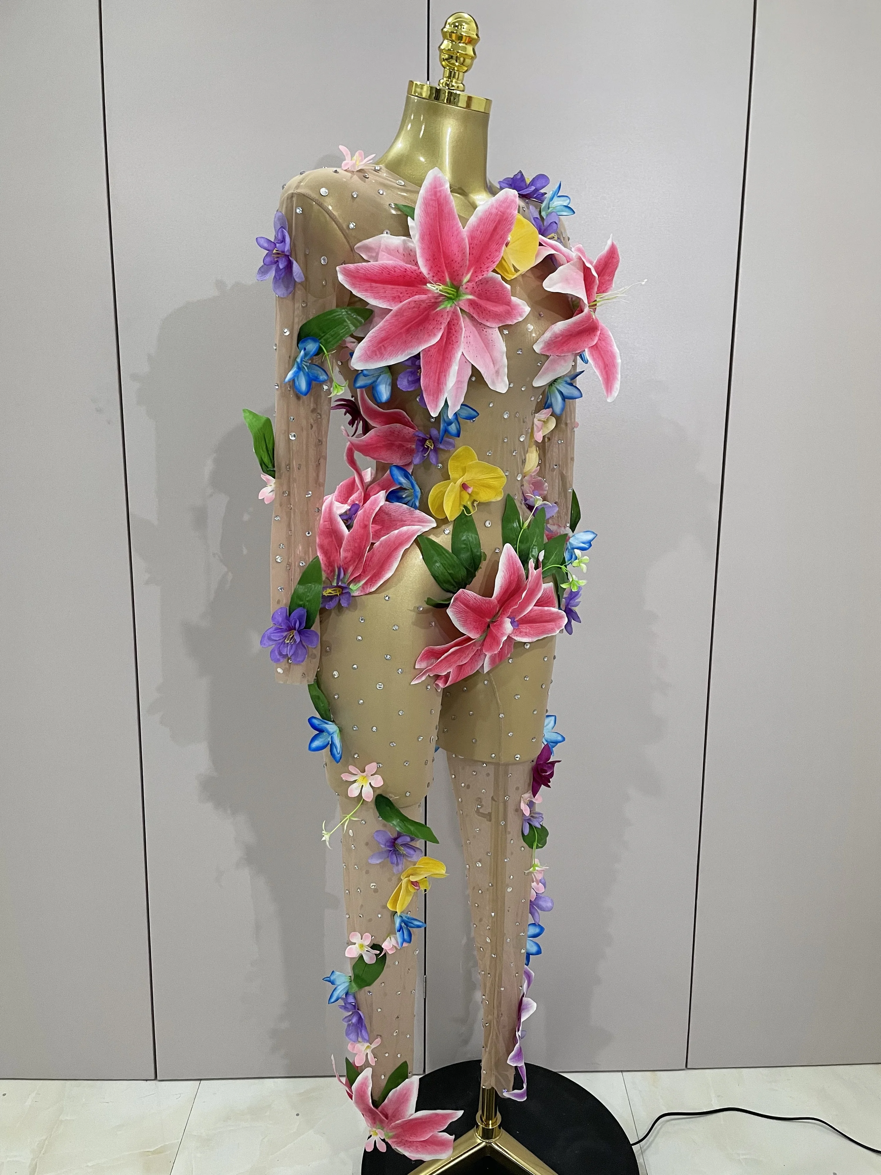 2025Sparkly Rhinestones 3D Flower Nude Mesh Transparent Jumpsut Women Evening Party Birthday Nightclub Performance Stage Costume
