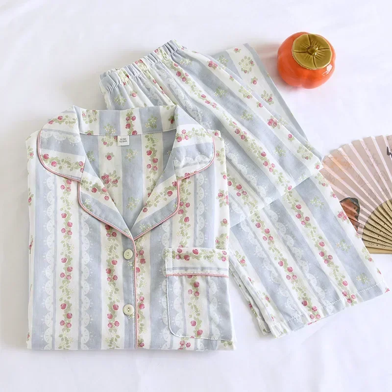 2026 Japanese New Women’s Pajama Set 100% Cotton Gauze Long Sleeve Long Pants Two Piece Set Fresh and Sweet Thin Home Clothing