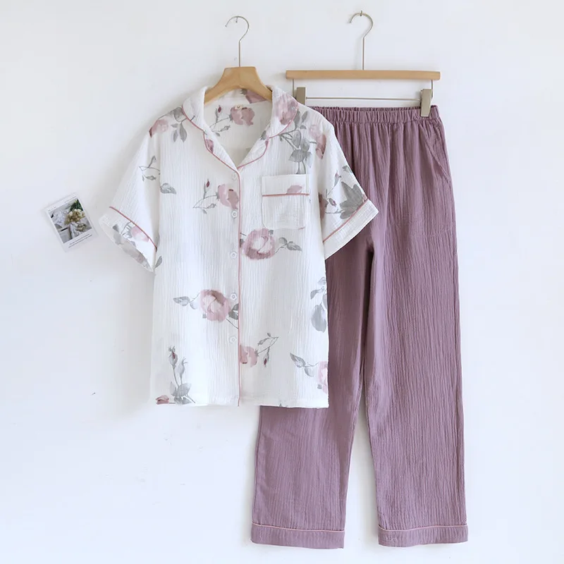 2026 Japanese Summer New Women’s Pajama Set Short Sleeve+Long Pants Two piece Set 100%Cotton Thin Cardigan Home Furnishing Fresh