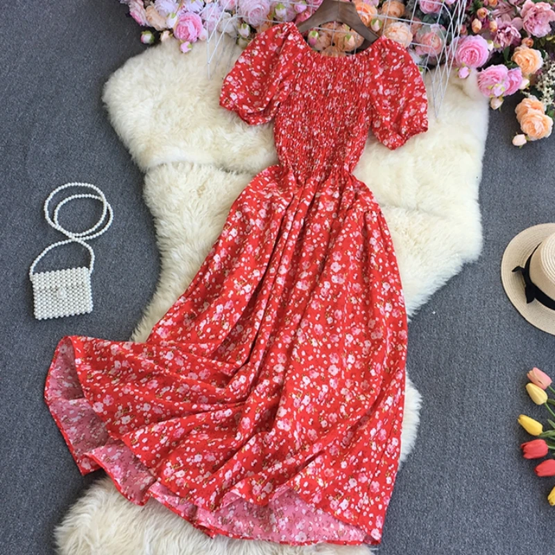 2026 New Fashion Summer Flower Print Long Dress Women Vintage Slash Neck Ruched Chest A Line Sundress Party Vestidos