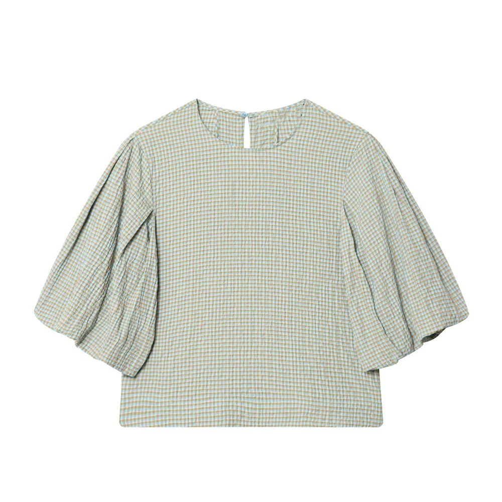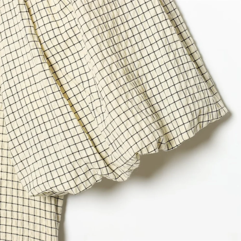 2026 New Women’s Fashion Simple and Versatile Short Sleeve Round Neck Checkered Balloon Sleeve Top
