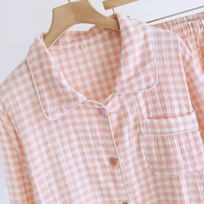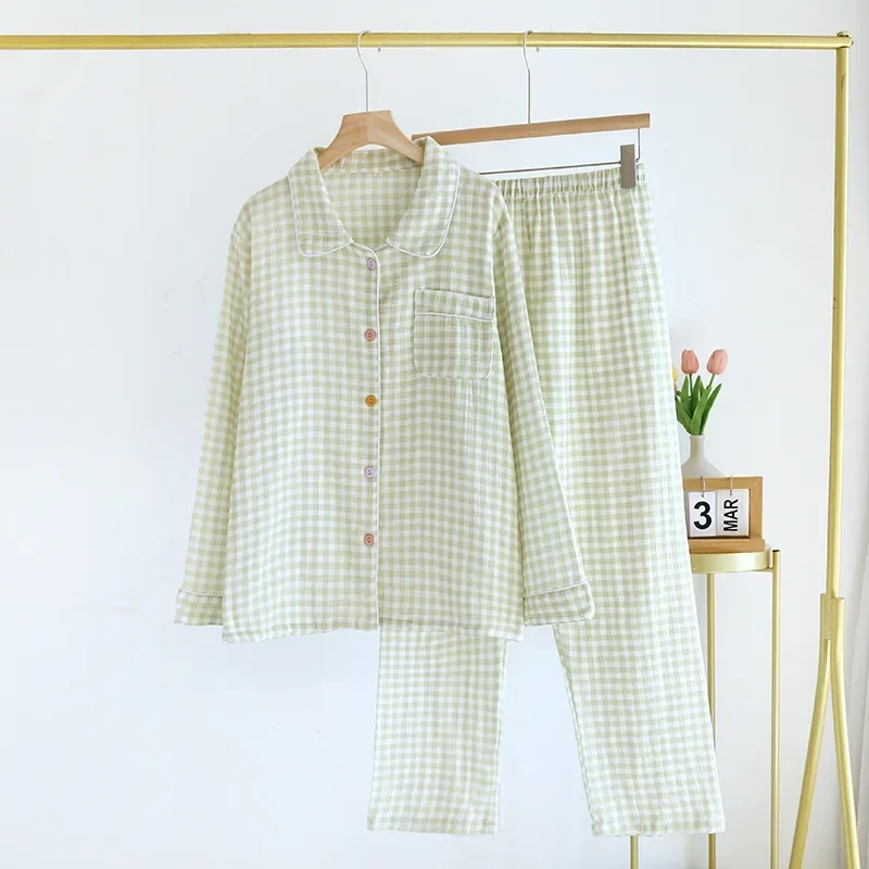 2026 Spring/Summer New Women’s Sleepwear Long Set 100% Cotton Plaid Long Sleeve Long Pants Two Piece Set Collar Home Clothes