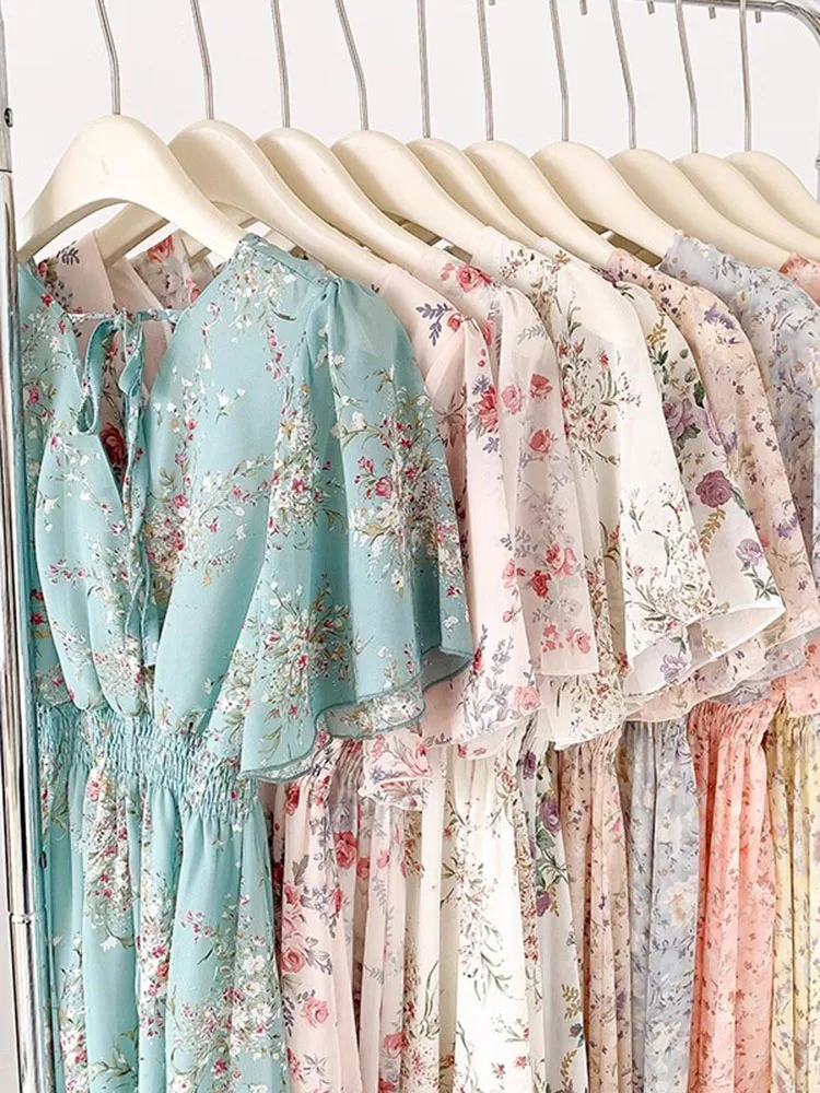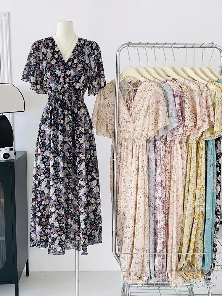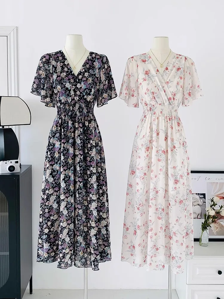2026 Summer Women Ruffled Short-sleeved Chiffon Dress V-neck High Waist Floral Print Beach Midi Dresses Backless Sexy Vestidos