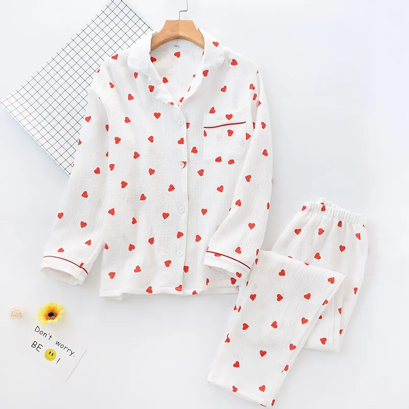 2PCS Heart Print Pajamas Suit Womens Spring Autumn Nightwear Turn Down Collar Shirt Pant Fashion Ladies Sleepwear Loose Casual