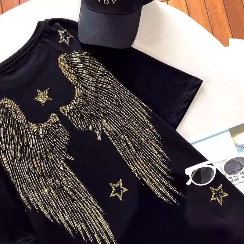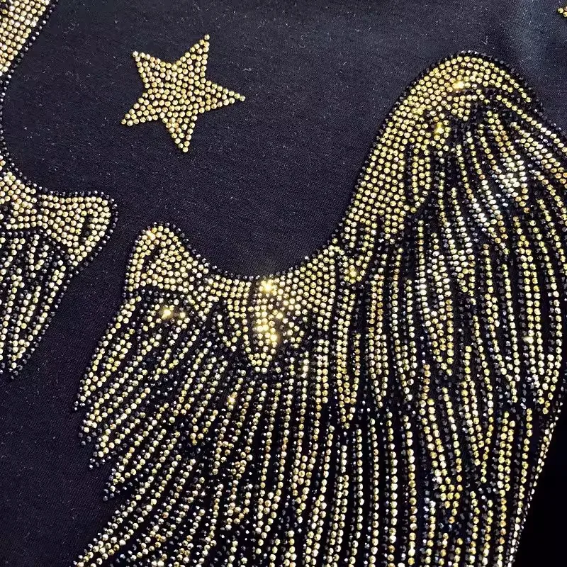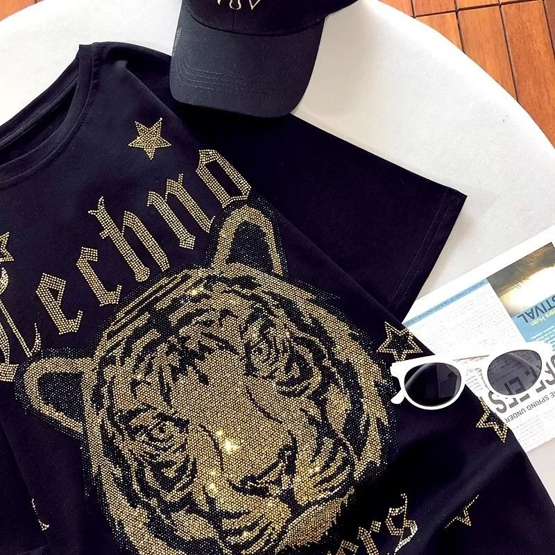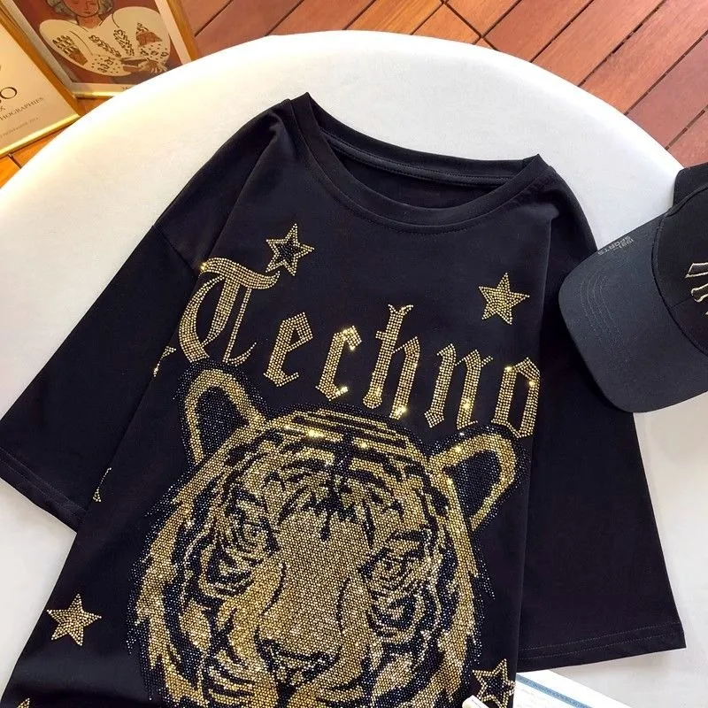 300 catties fashion wear rhinestone diamond tiger head back wings diamond black women’s short-sleeved T-shirt top