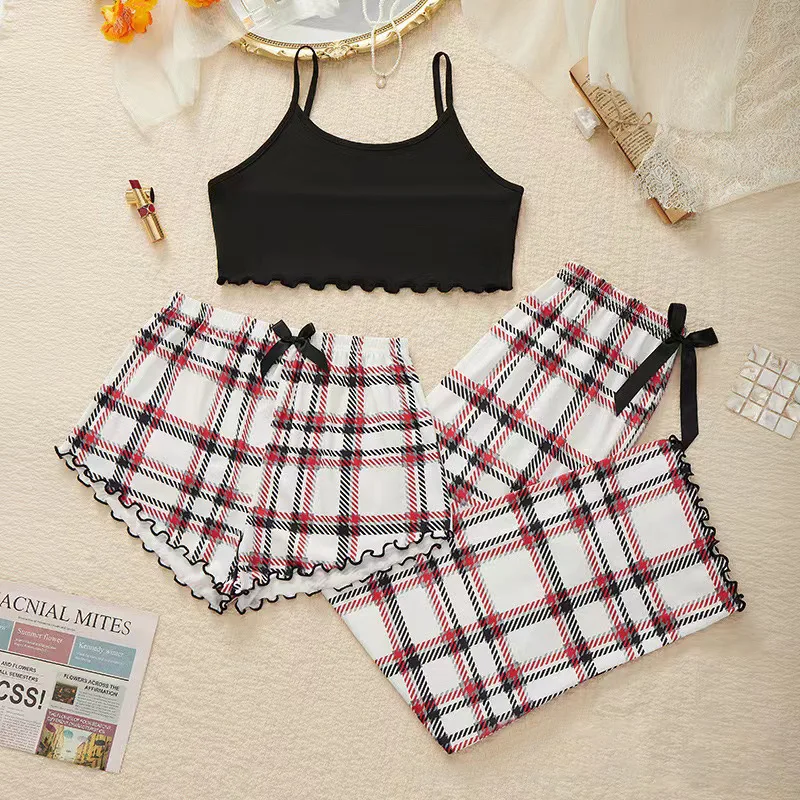 3Pcs Women’s Pajama Set Camisole Shorts Trousers Three-Piece Bow Tie Home Wear Set Plaid Print Sleepwear for Women Christmas pjs