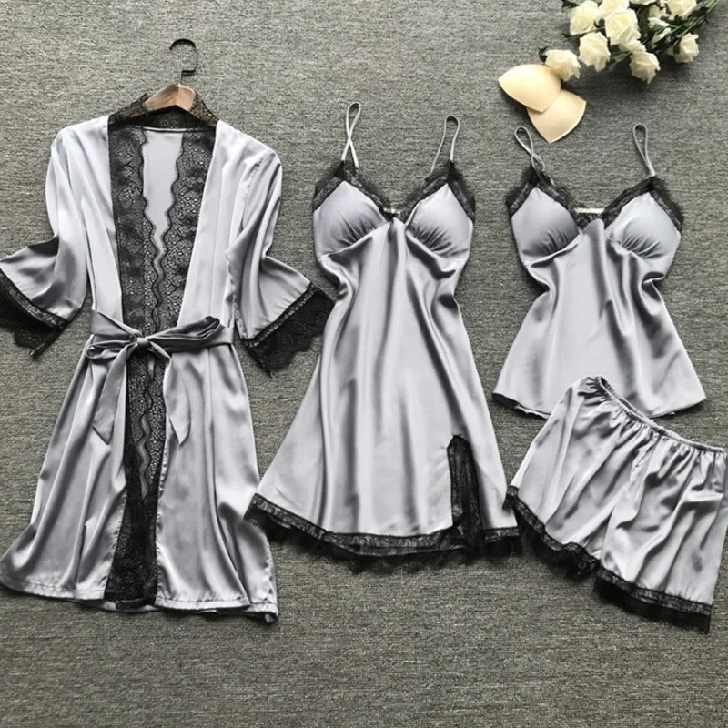 4 Pieces/Set Women’s Sexy Lace Pajamas Fashion V-Neck Gown Comfort Pajamas Pajamas Pajamas with Chest Pads Nightdress