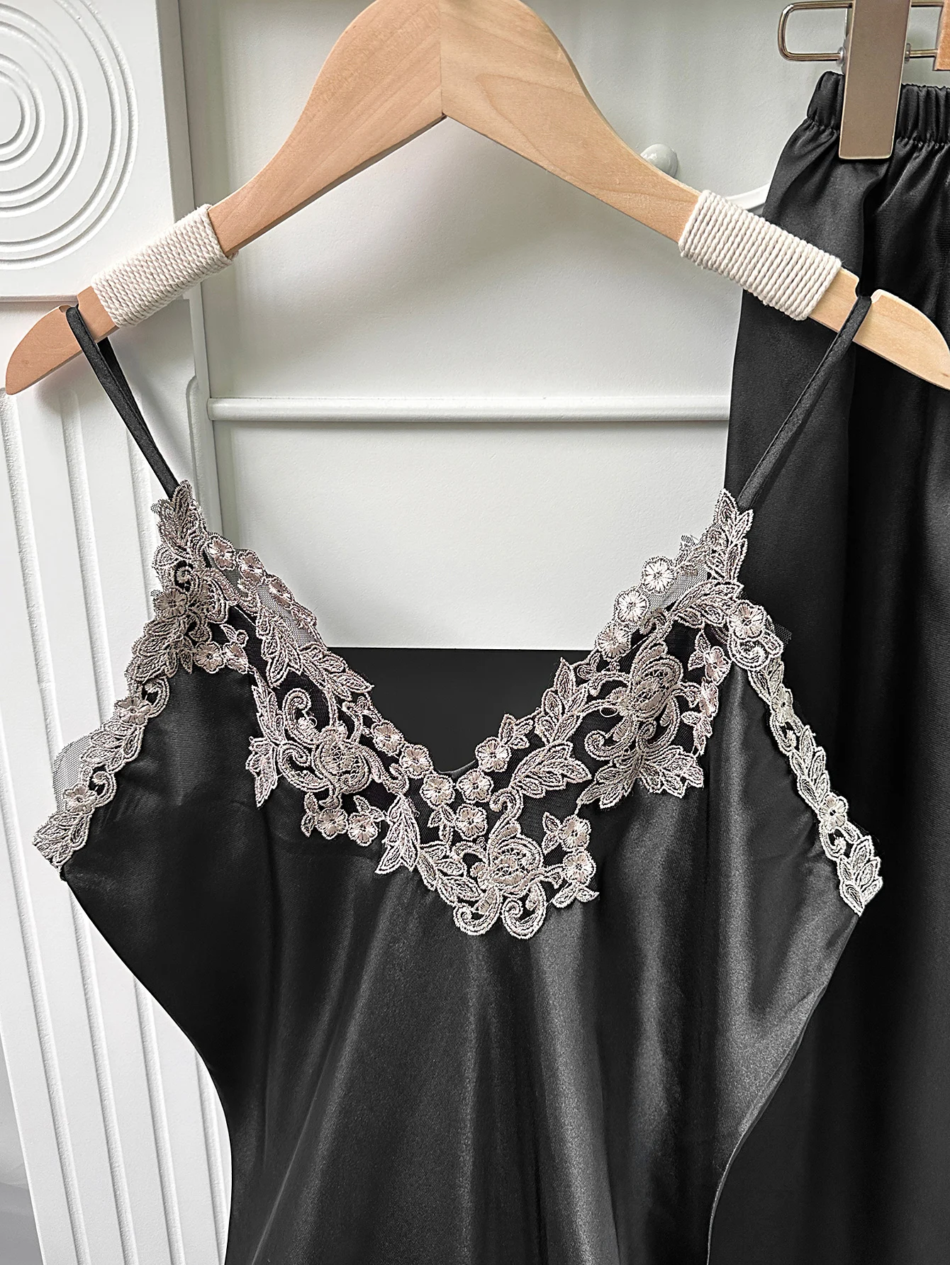 5 Piece Satin Sleep Set Lace Trim Slip Dress Cami Top Ruffle Shorts Lounge Pants Women’s Loungewear Sleepwear