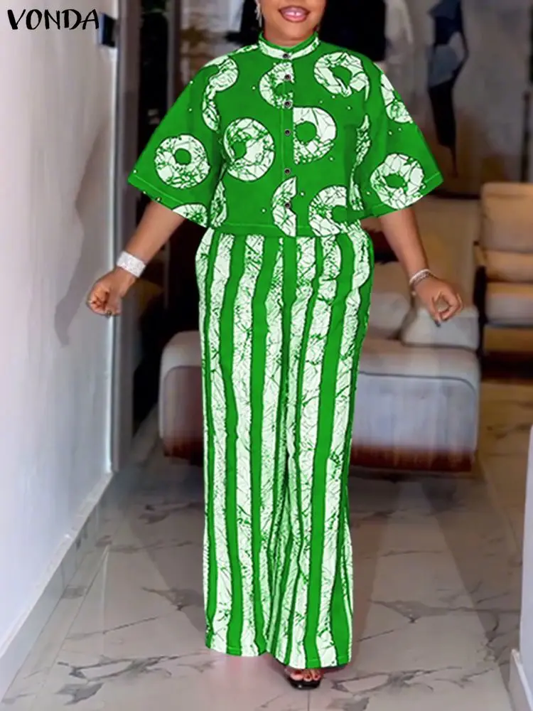 5XL VONDA Plus Size 2 Piece Outfits Autumn Women Bohemian 3/4 Sleeve Fashion Shirts Wide Leg Pants Print Vintage Pant Sets 2PCS