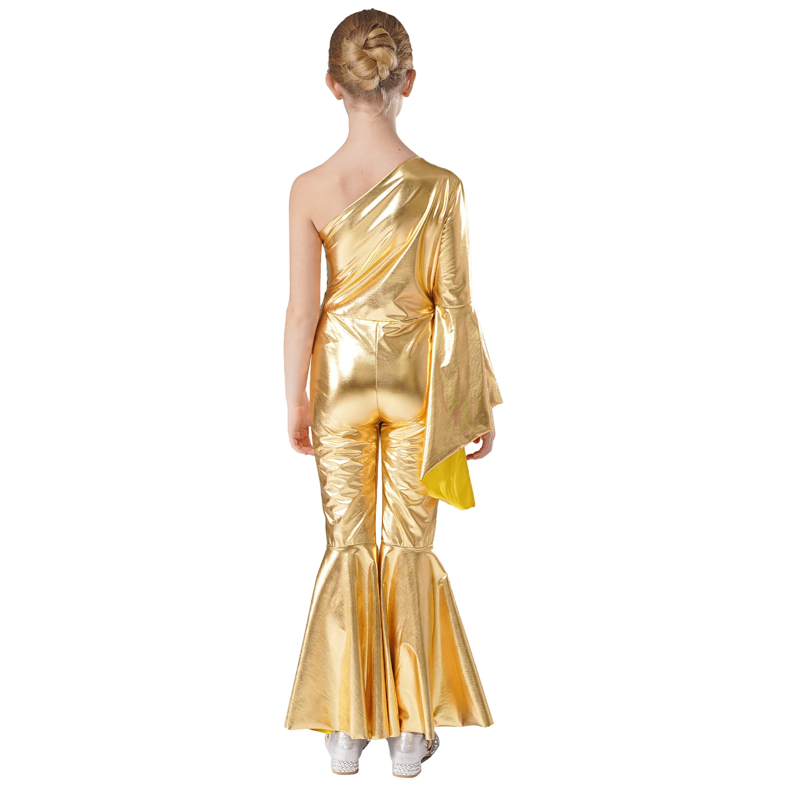 70S Disco Vintage Jumpsuit Metallic Shiny One Flare Sleeve Bodysuit Hippie Bell Bottom Jazz Dance Carnival Rave Party Costume