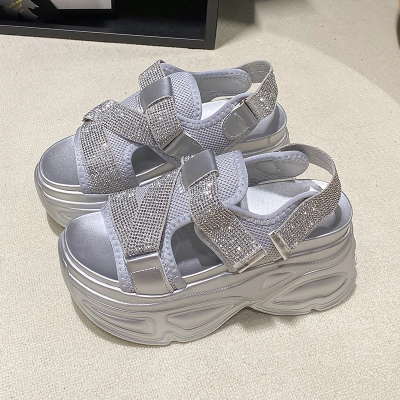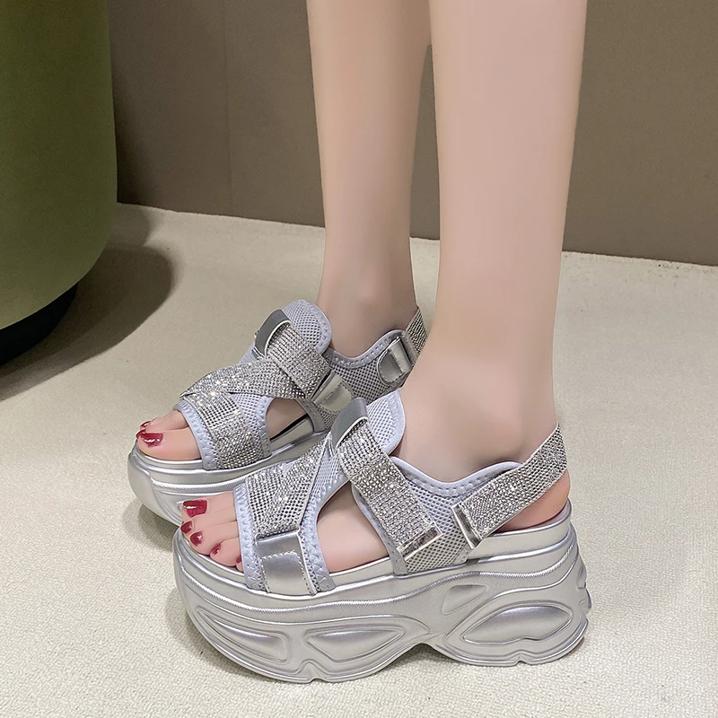 8.5CM Platform Sandals Women Bling Wedge High Heels Summer Rhinestone Hook Loop Chunky Sandalias Beach Slippers Zapatos Mujer