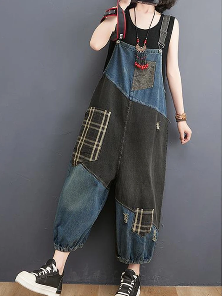 Amax luluE Korean Fall Jeans Womens Plaid Ripped Denim Overalls Ladies Vintage Punk Loose Pants Luxury Classic Casual Trousers