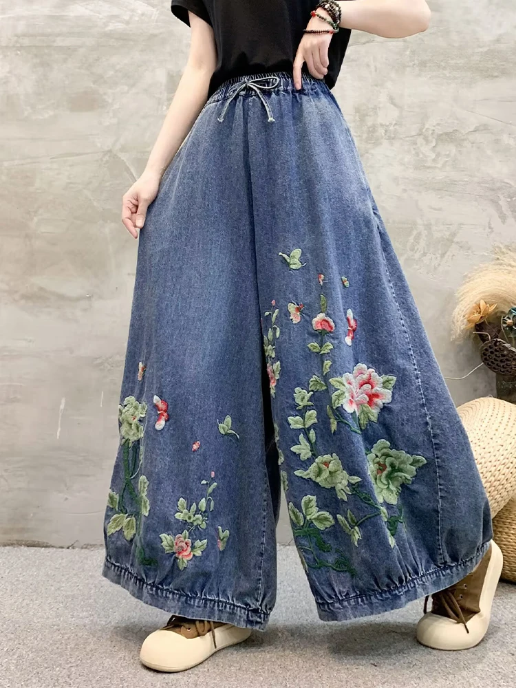 Fashion Loose Embroidery Floral Denim Wide Leg Pants