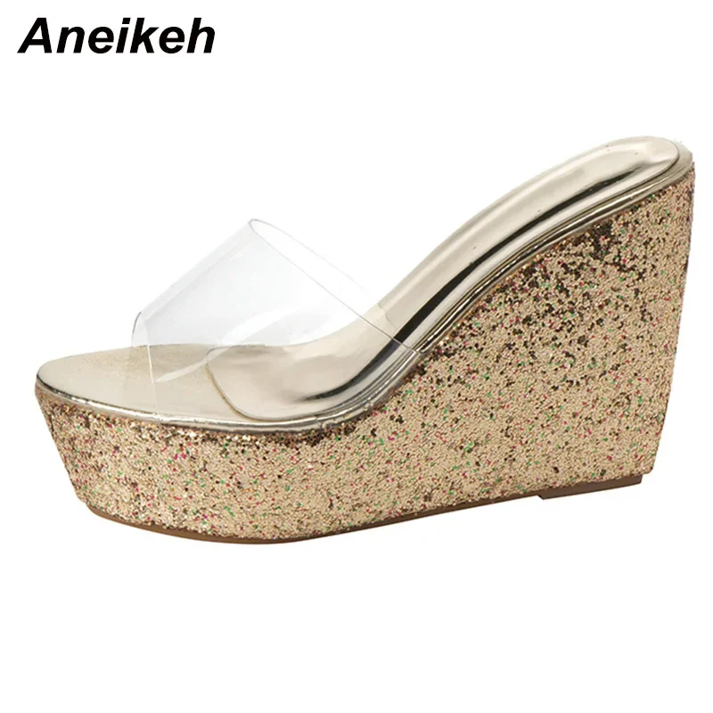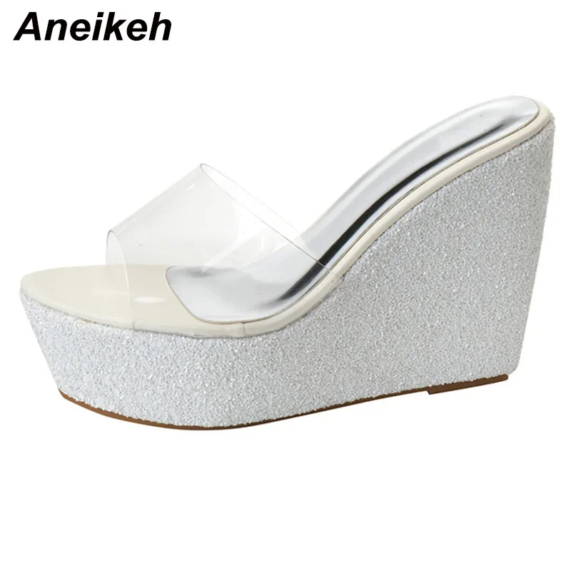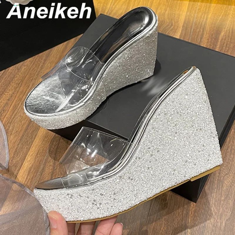 Aneikeh Summer 2026 New Fashion Sequins Transparent Rubber Wedge Heel Thick Sole Sandals for Women 10CM Open Toe Ladies Shoes