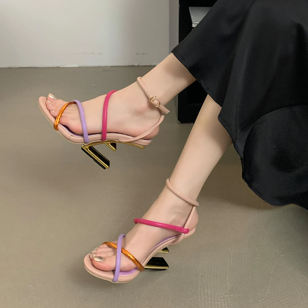 Aneikeh Summer Fashion Fretwork Heels Cross Striped Color Blocked High-heeled Sandals Women Ankle Buckle Strap Gladiator Shoes
