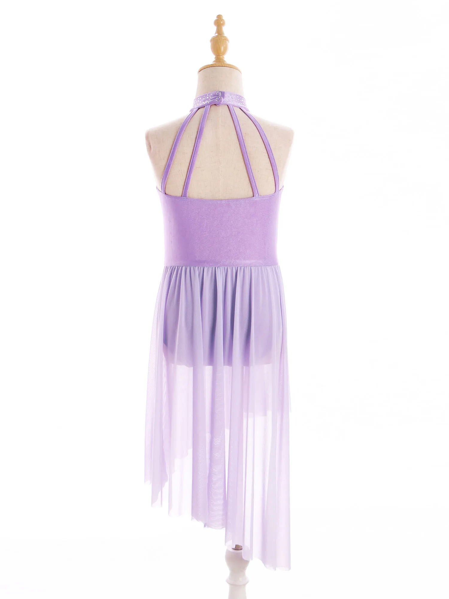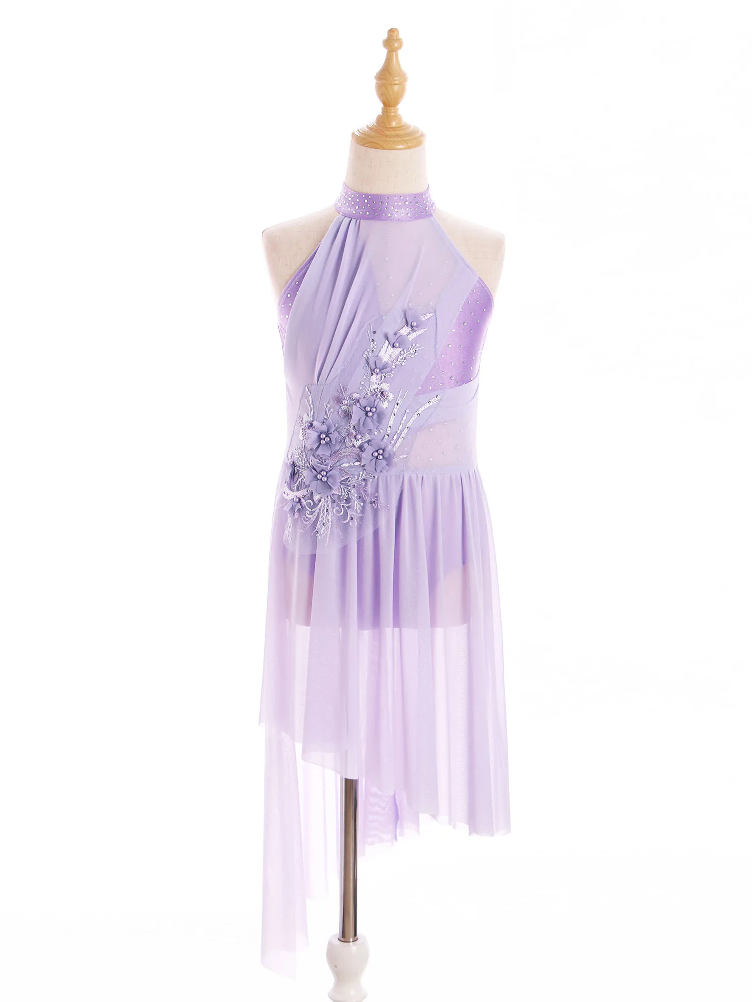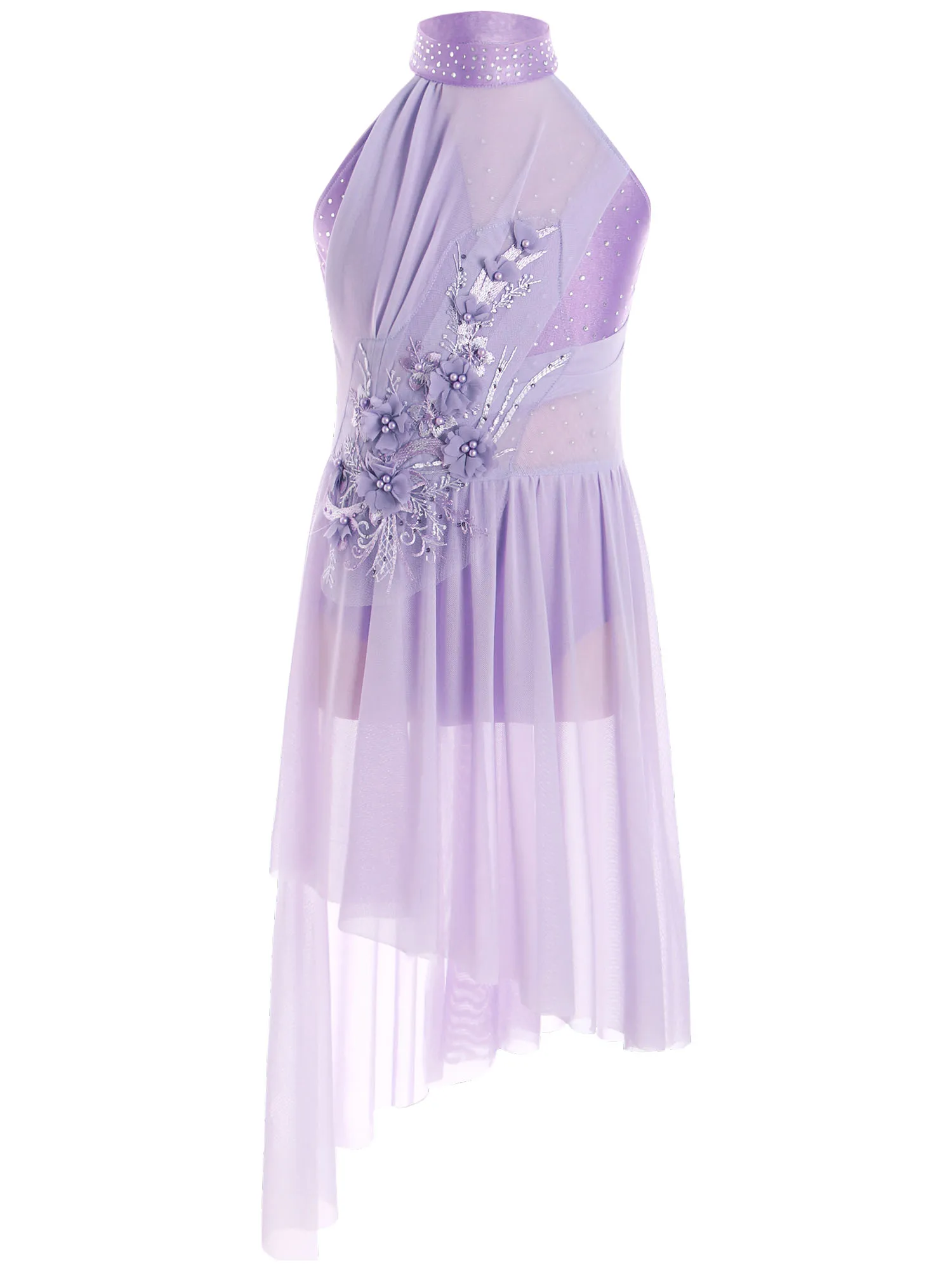 Built-in briefs provide extra coverage for ease of movement. Irregular sheer mesh skirt with flowy design shows the beauty of dance.