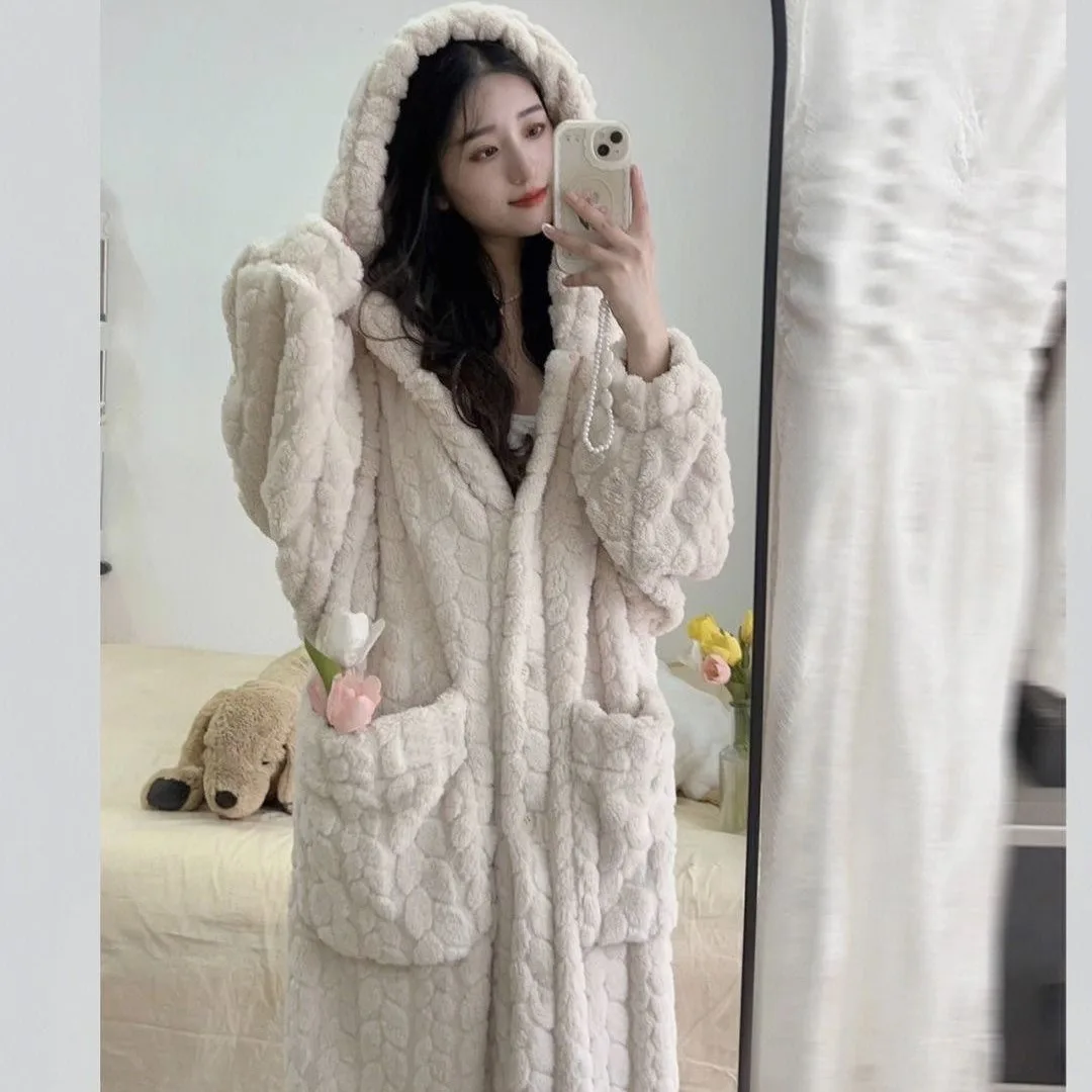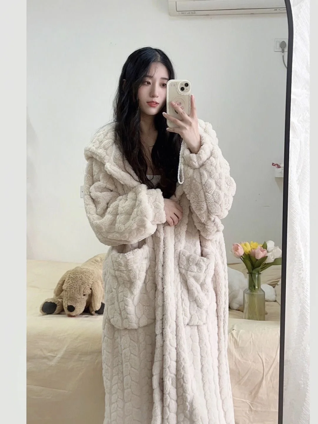 Autumn and Winter Nightwear for Women Flannel Dressing Gown for Women Coral Fleece Long Korean-Style Homewear Lazy Dressing Gown