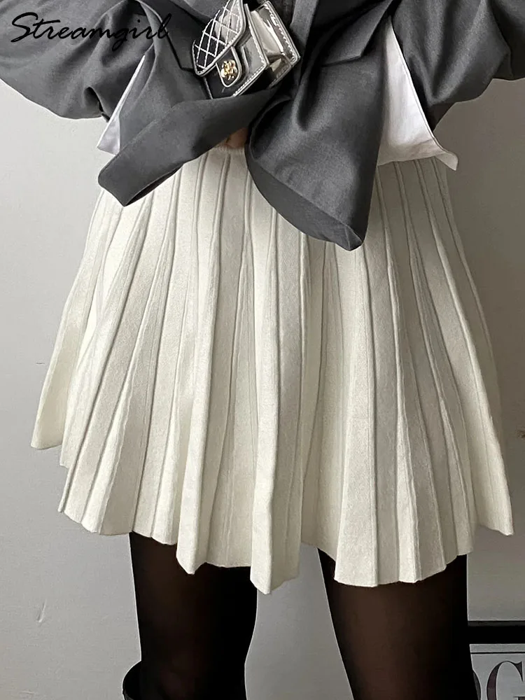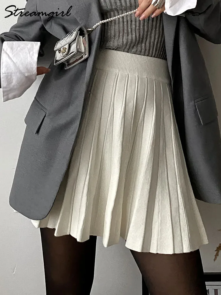 Autumn Knit White Mini Pleated Skirts For Women A Line Skirt Gray High Waist Women Knitted Pleated Short Skirts Korean Fashion