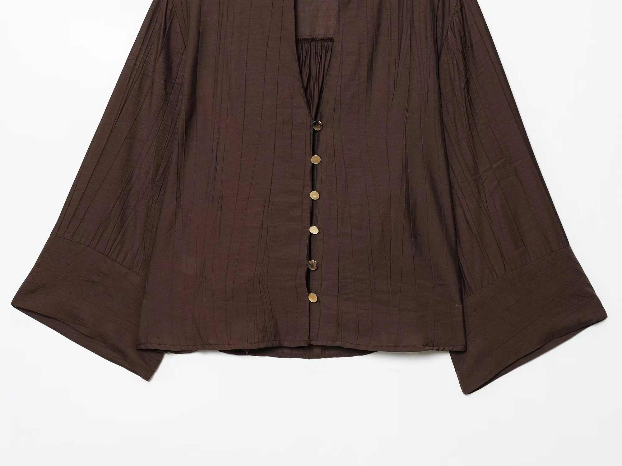 Autumn new women’s loose and simple V-neck long sleeved shirt with elastic waist and wide leg pants set