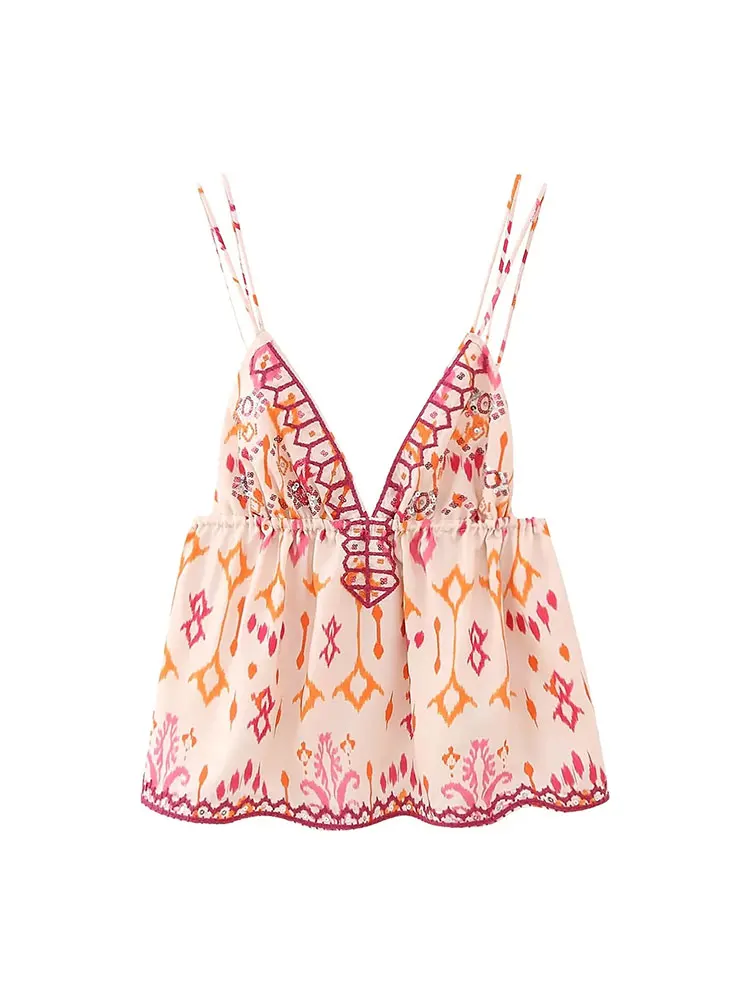 Autumn Printed Suspender Tank Tops for Women Casual Sleeveless V-Neck Cropped Blouse Vacation Chic Ladies Streetwear